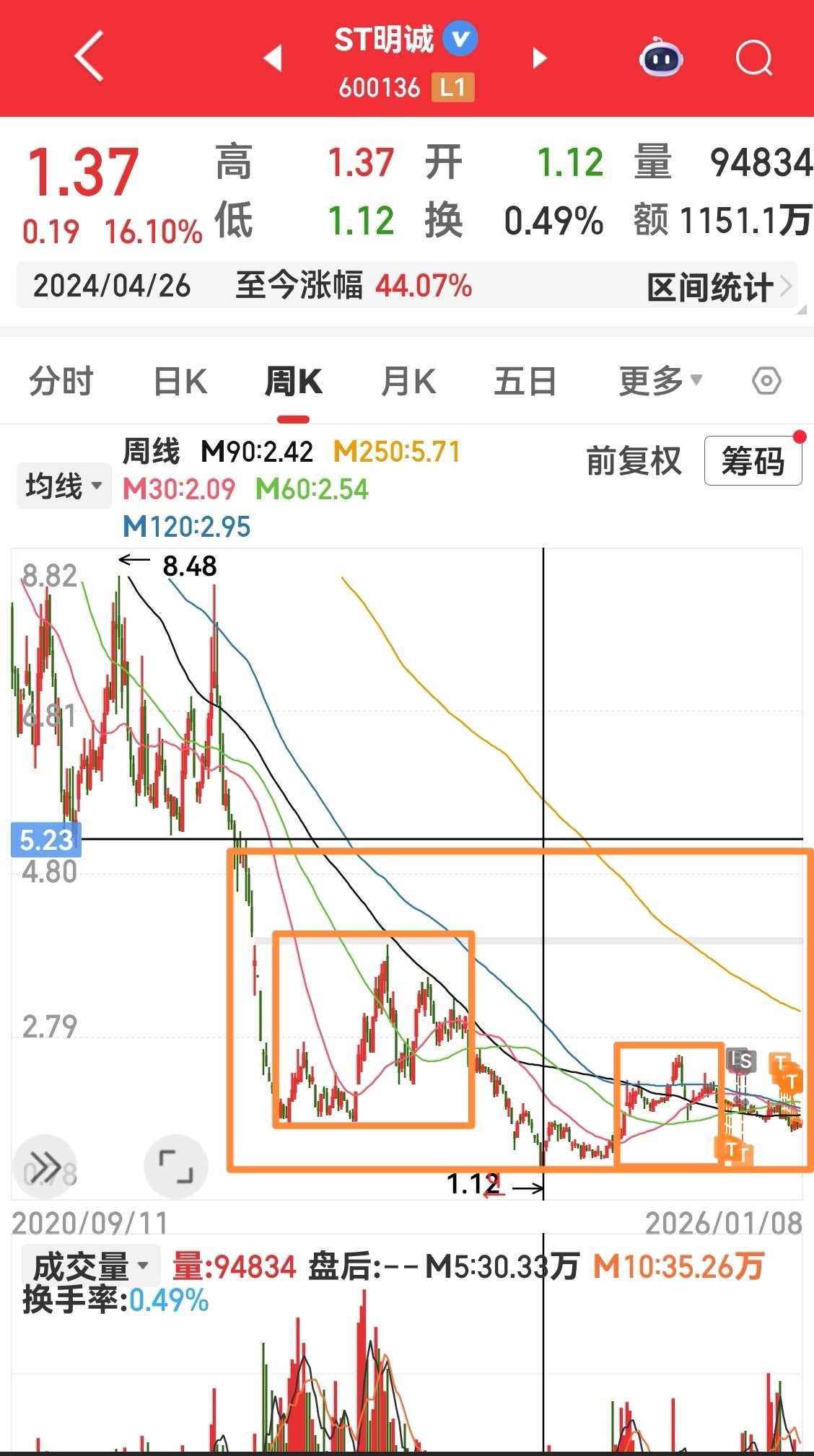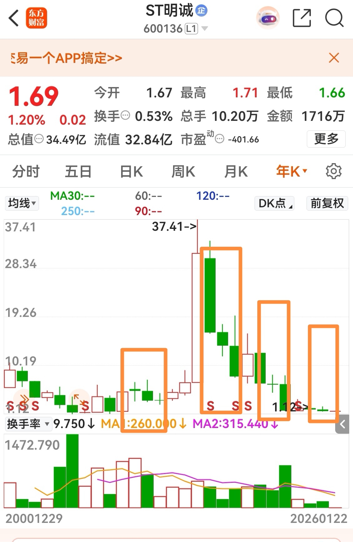ST京蓝,ST明诚,都是由*ST→ST。价格也差不多。所处于周K月K的低位区域。