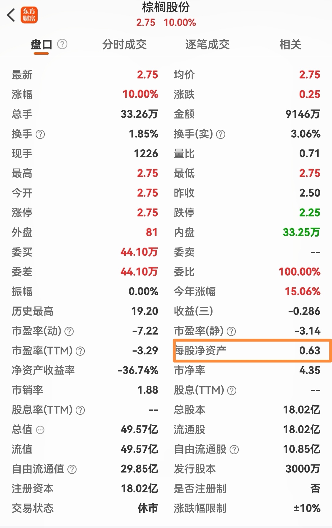棕榈股份,净资产0.63元,能够涨停板与净资产0.63元没有一分钱关系。