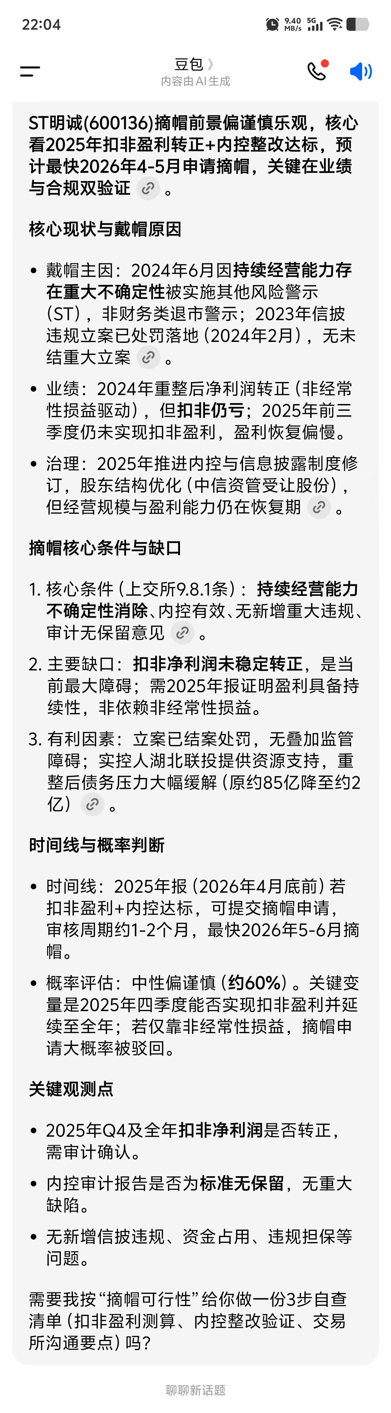 大家看过来,这几天仔细看了600136公告,它风险警示原因在于持续经营,如果改善这个那大概率摘帽可期,即使由于行政决定发布,也应该先摘帽再戴帽。。。如果明年4月底前没有行政处罚决定发布,大概率先摘帽。