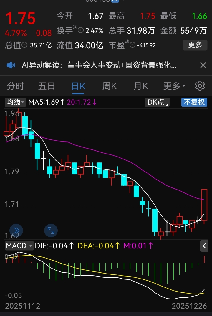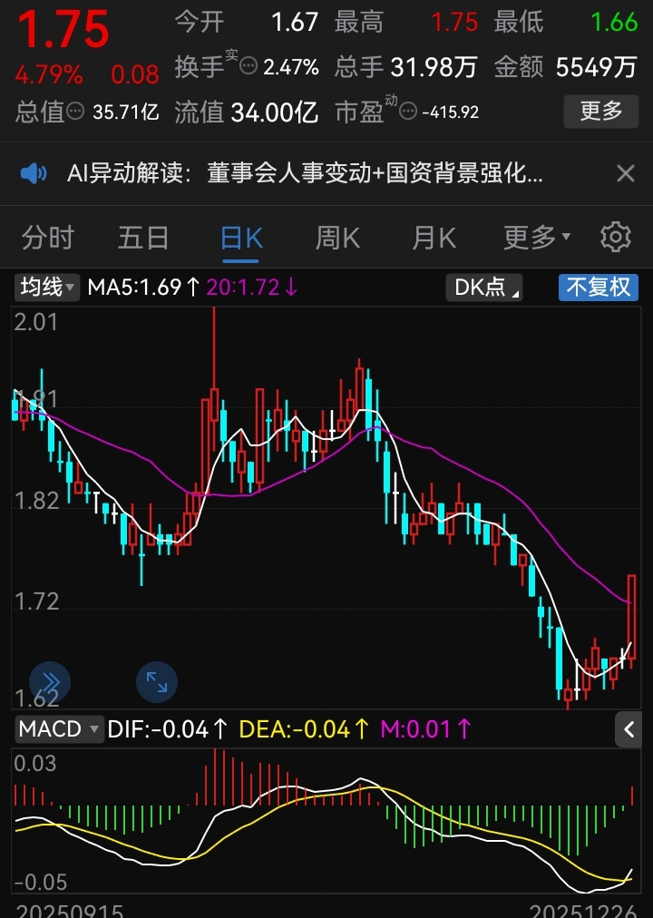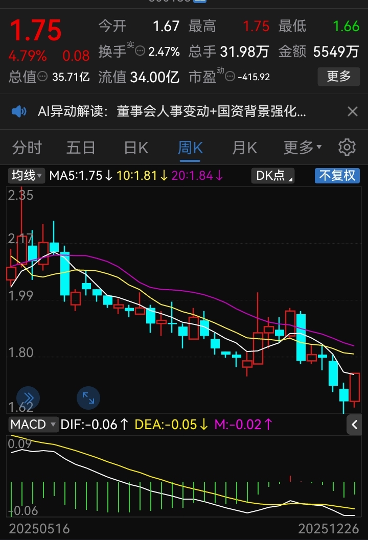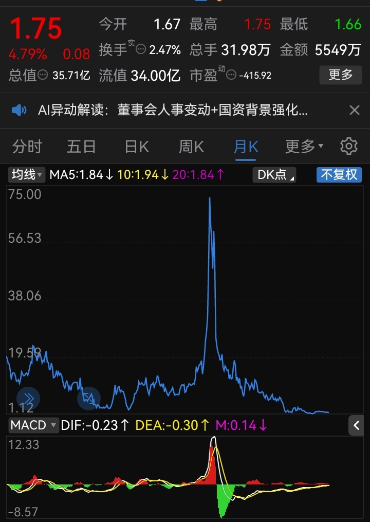 空间有43倍,股价处于历史最低位,时间上,已调整四年,周线MACD水下二次金叉,拍过百日盯盘,日线绿柱变红柱,水下金叉起点,概念上是热门,实控人省国资,盘面是小盘股,50%以上被国资持有,咋看都得梭哈,一句话,重仓干,买错也要买