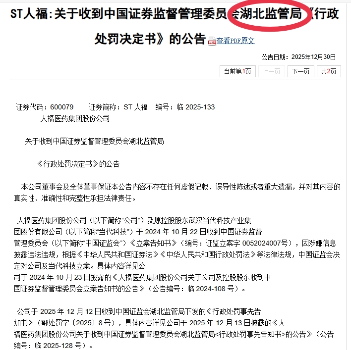 特大利好!《处罚决定书》不再由证监会签发!改由省级证监局签发!ST人福,湖北省第