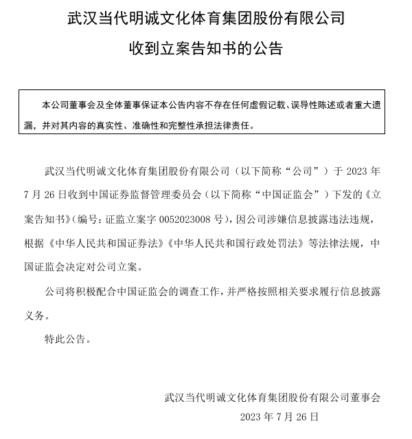 武汉当代明诚文化体育集团股份有限公司(以下简称“公司”)于2023年7月26日收到中国证券监督管理委员会(以下简称“中国证监会”)下发的《立案告知书》(编号:证监立案字0052023008号),因公司涉嫌信息披露违法违规,根据《中华人民共和国证券法》《中华人民共和国行政处罚法》等法律法规,中国证监会决定对公司立案。(公告编号:临2023-089号) 2024年2月23日,公司收到中国证监会湖北监管局下发的《行政处罚事先告知书》[鄂处罚字(2024)1号],现将相关内容公告如下: 一、《行政处罚事先告知书》主要内容 “武汉当代明诚文化体育集团股份有限公司、易仁涛、李珍玉、高维、闫爱华、喻凌霄: 武汉当代明诚文化体育集团股份有限公司(以下简称当代明诚或公司)涉嫌信息披露违法一案已由我局调查完毕。我局拟依法对你们作出行政处罚。现将我局拟对你们做出行政处罚所根据的违法事实、理由、依据及你们享有的相关权利予以告知。 经查明,当代明诚涉嫌信息披露违法的事实如下: (一)2020年年报披露的担保事项存在重大遗漏 1.公司为关联方当代投资向湖北合作及其子公司借款提供担保 2020年1月21日,武汉当代科技投资有限公司(以下简称当代投资)与湖北合作银通融资租赁有限公司(以下简称湖北合作银通)签署《借款合同》,借款合同约定,由湖北合作银通向当代投资借款4亿元。同时,当代明诚等主体与湖北合作银通分别签署了《保证合同》,为前述借款提供担保。 2020年12月11日,当代投资与湖北合作投资集团有限公司(以下简称湖北合作)签署《额度授信合同》(约定授信金额为3.1亿元),后又签署《借款合同》明确借款金额为2.6亿元。当代明诚等主体与湖北合作分别签署了《保证合同》,为借款提供担保。 2.公司为雨石矿业向中经贸易借款提供担保 武汉市雨石矿业有限公司(以下简称雨石矿业)为当代投资的全资子公司,当代投资与当代明诚的实际控制人均为艾路明,依据《上市公司信息披露管理办法》(证监会令第182号)第六十二条第(四)项关于上市公司的关联法人中规定的“3.关联自然人......间接控制的......除上市公司及其控股子公司以外的法人”,雨石矿业为当代明诚的关联方。 2019年6月,湖北省中经贸易有限公司(以下简称中经贸易)与雨石矿业签订合同,约定由中经贸易向雨石矿业提供借款12亿元,武汉当代科技产业集团股份有限公司(以下简称当代集团)为上述借款提供不可撤销的差额补足承诺,当代明诚为当代集团的差额补足承诺提供连带保证责任。2020年6月,上述借款尚余7.5亿元未还,当代明诚再次对当代集团的差额补足承诺提供连带保证责任。 3.公司为新英开曼对亚足联付款义务提供全额担保 2020年11月26日,当代明诚控股子公司Super Sports Media Inc.(以下简称新英开曼)与亚洲足球联合会(以下简称亚足联),签订了相关许可协议及附属协议。根据协议,新英开曼获得了2021年至2024年亚足联授权赛事在中国大陆地区的版权和赞助权益;约定新英开曼向亚足联支付相关对价,并约定分期支付上述金额。在协议附件中的相关担保函中,约定由当代明诚就主协议中新英开曼对亚足联的1.5亿美元付款义务提供全额保证担保。 4.公司为当代足球俱乐部向曾某潮借款提供担保 2020年6月4日,曾某潮与当代明诚足球俱乐部有限公司(以下简称当代足俱)签订合同,约定由曾某潮向当代足俱提供借款700万元。2020年6月5日,当代明诚与曾某潮、当代足俱三方签署了《保证合同》,约定当代明诚为当代足俱的借款偿付义务提供不可撤销的连带责任保证。 上述四项担保均未在2020年年报中披露,构成《中华人民共和国证券法》(以下简称《证券法》)第一百九十七条第二款规定的重大遗漏。2023年10月9日,公司发布《关于公司诉讼的进展公告》,公告称收到法院判决,当代明诚不承担对当代投资借款的担保责任。2023年11月13日,公司发布《关于公司与原控股子公司与亚洲足球联合会担保解除的公告》,至此公司为新英开曼对亚足联付款义务提供全额担保责任解除。公司《重整计划》中披露,当代集团及其关联方已向公司出具书面承诺函,承诺以无条件豁免与公司依法应承担的赔偿责任等额的公司对当代集团及其关联方的债务的方式,解除公司的违规担保问题。 (二)2020年年报存在虚假记载 2018年12月3日,当代明诚与武汉文信股权投资合伙企业(有限合伙)(以下简称文信基金)等主体签署《武汉当代银兴影业投资管理有限责任公司股权转让协议》,约定文信基金出资2,021万元受让当代明诚持有的其控股子公司武汉当代银兴影业投资管理有限责任公司(以下简称当代银兴)10.11%股权。 同日,当代明诚与文信基金签署了《武汉当代银兴影业投资管理有限责任公司投资协议》约定若当代银兴未完成业绩承诺,则公司须按照年化10%的收益率回购文信基金所持当代银兴的股权。当代明诚、文信基金及武汉众视盛纳文化传媒有限公司还签订《武汉当代银兴影业投资管理有限责任公司投资协议之补充协议》,约定自文信基金投资当代银兴满24个月后,当代明诚无条件回购文信基金所持当代银兴的股权。根据约定,当代明诚应当在2020年12月11日前支付回购款项。当代明诚在触发回购义务的情况下,未在2020年年报中将上述2,021万元股权投资款的回购债务确认为负债,构成《证券法》第一百九十七条第二款规定