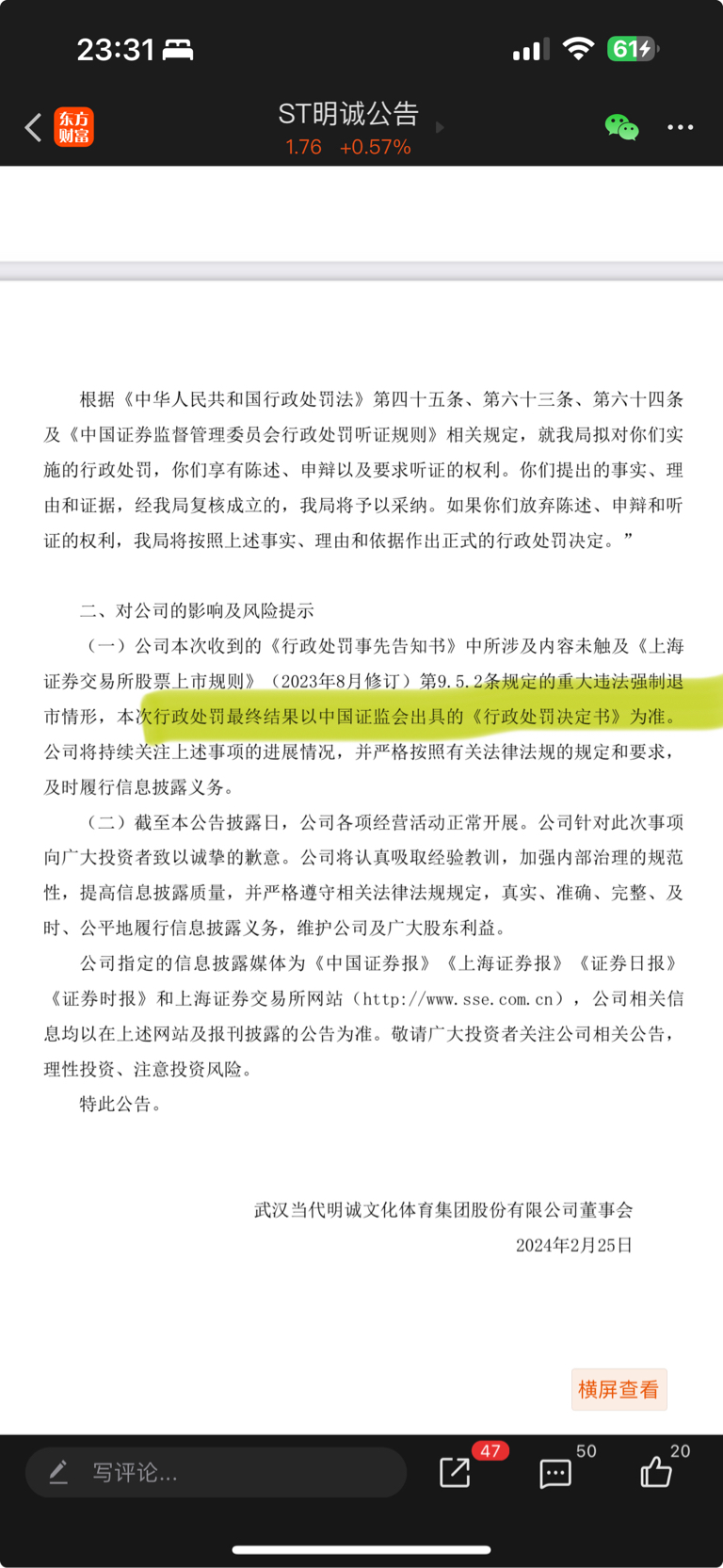 $ST明诚(SH600136)$ 2024年2月公司收到湖北证监局下发的《行政处罚事先告知书》,但截至2026年2月,正式处罚决定书仍未下达。会不会有什么问题?