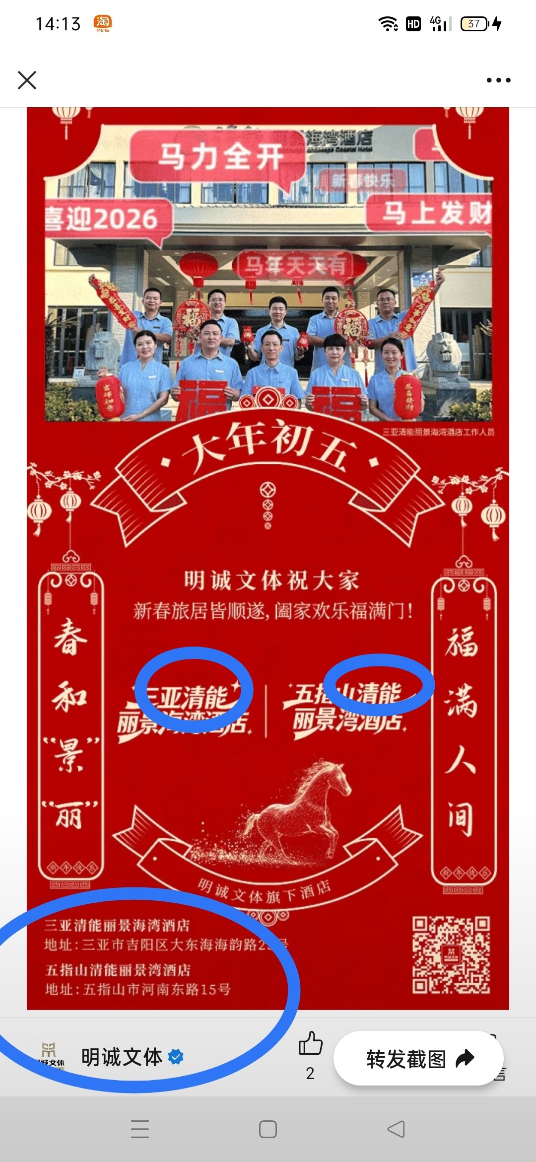 (清能)海南三亚酒店,(清能)海南五指山酒店,发来贺电!大年初五,迎财神!恭祝明诚股东,马年发大财!明诚文体2026起飞!