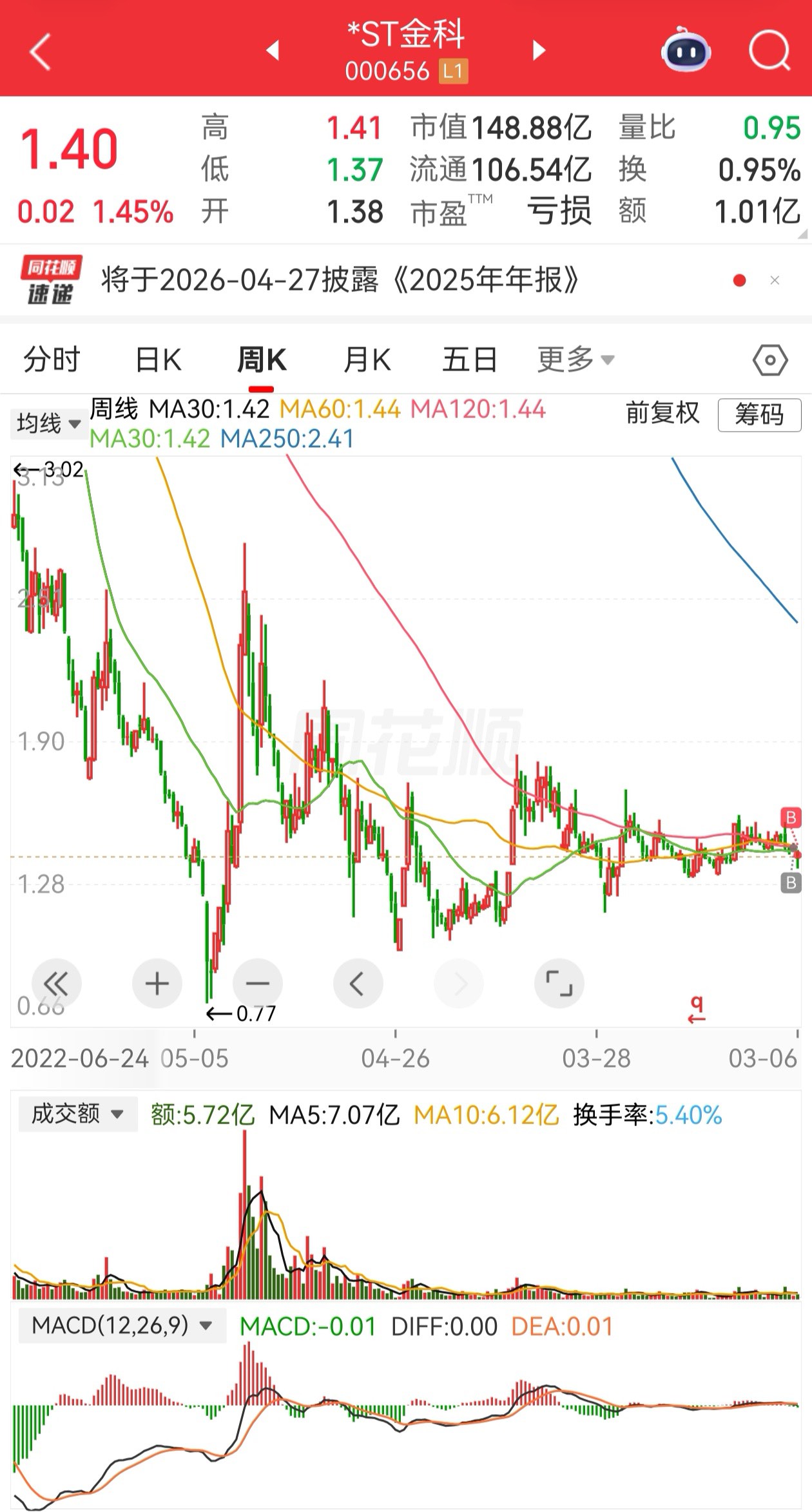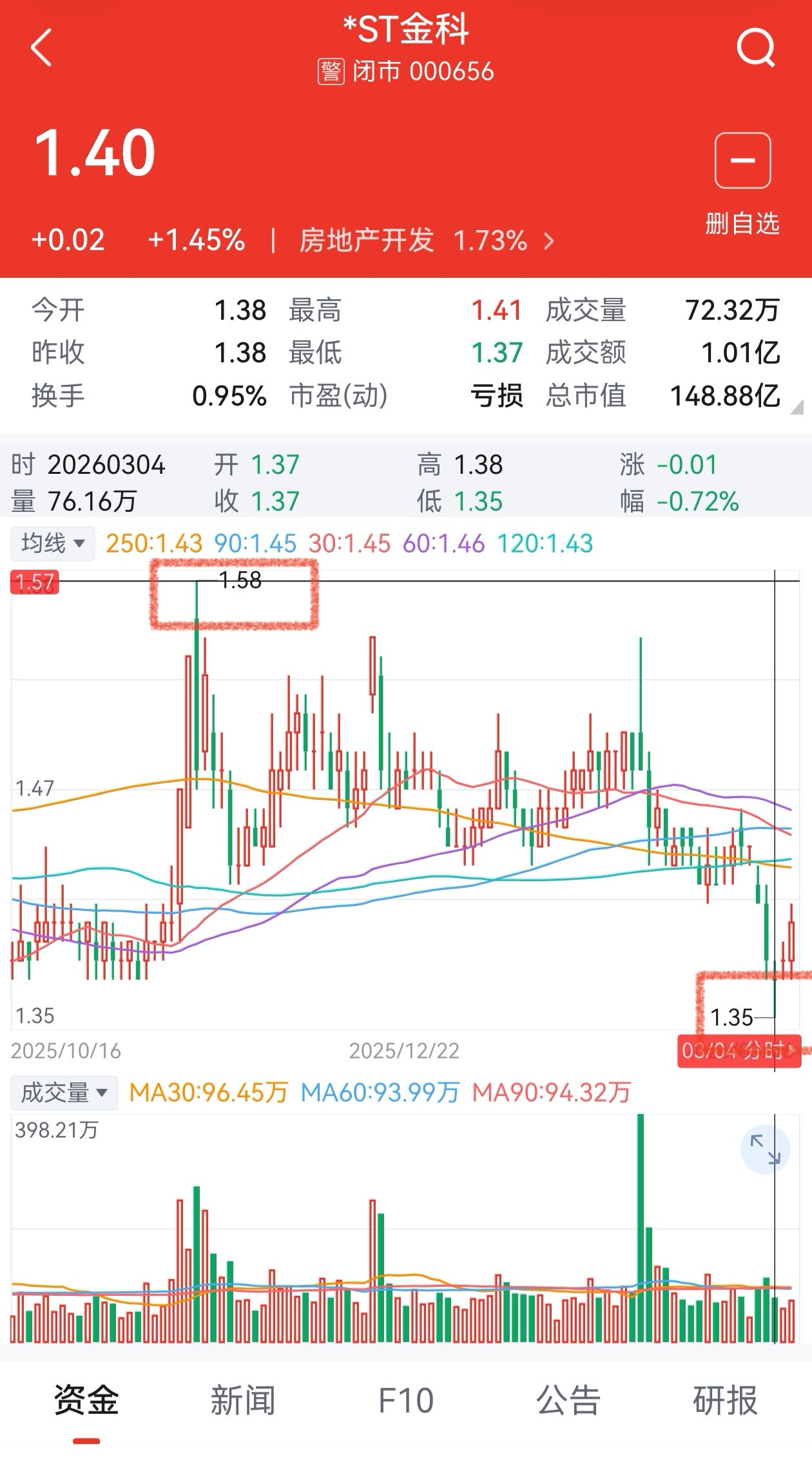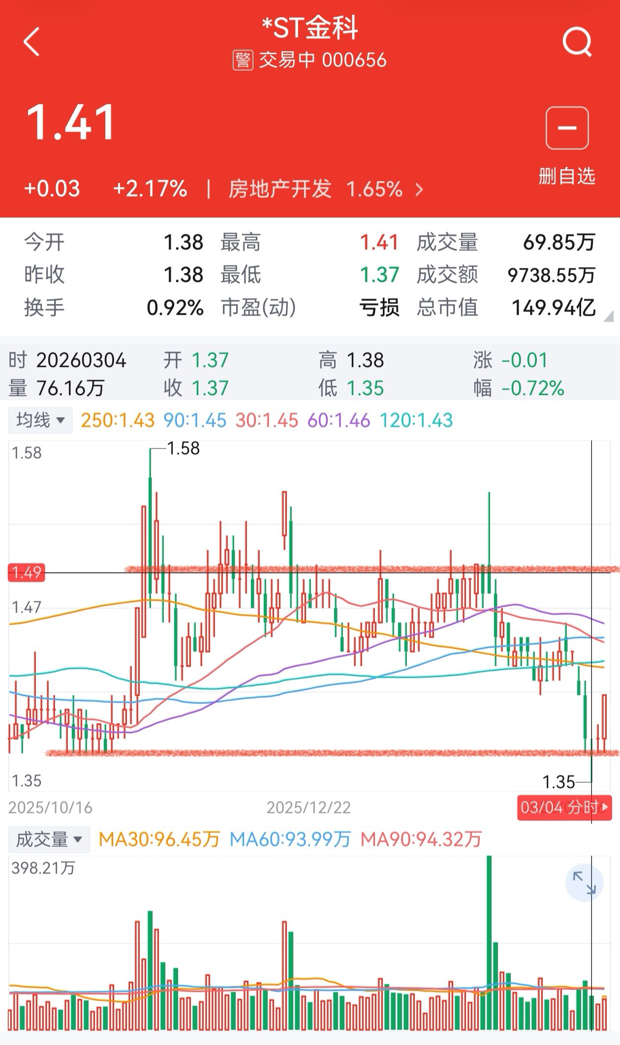 *ST金科,近期最高价1.58加最低价1.35=2.93,求平均=1.465,即低于1.47为超跌,控制好仓,适量建仓。