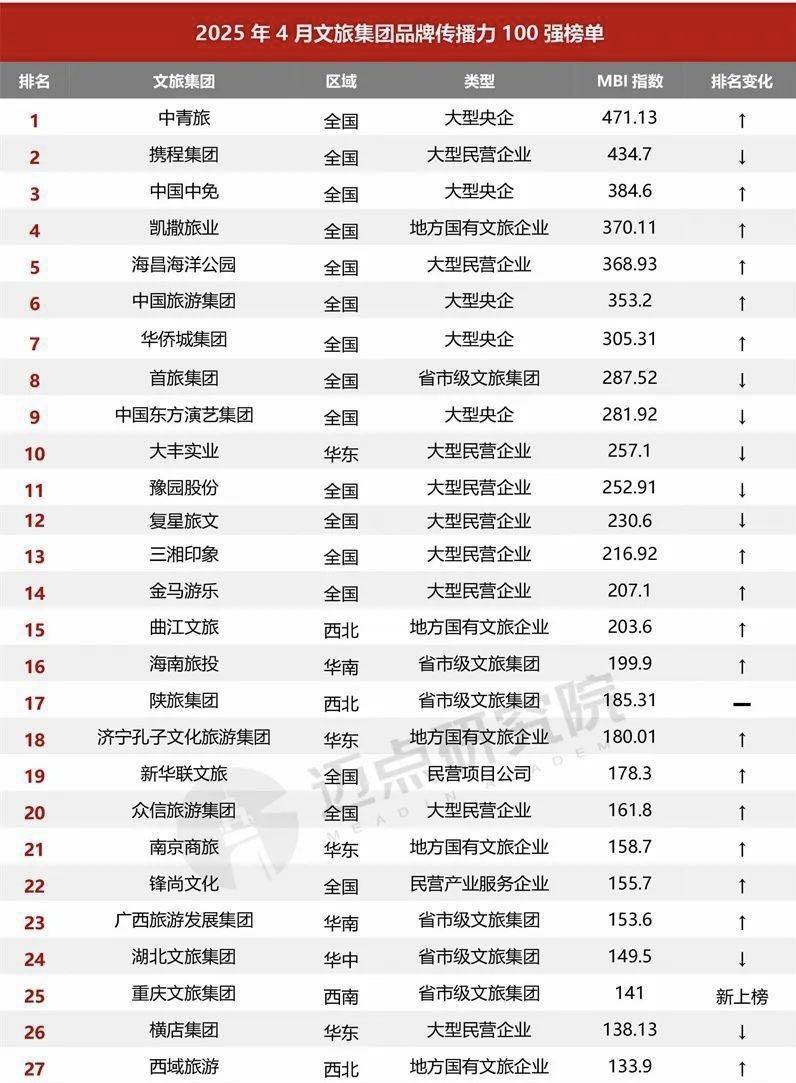 2025年中国文旅集团品牌传播力中青旅第一携程集团第二(巅峰市值4000亿)中国