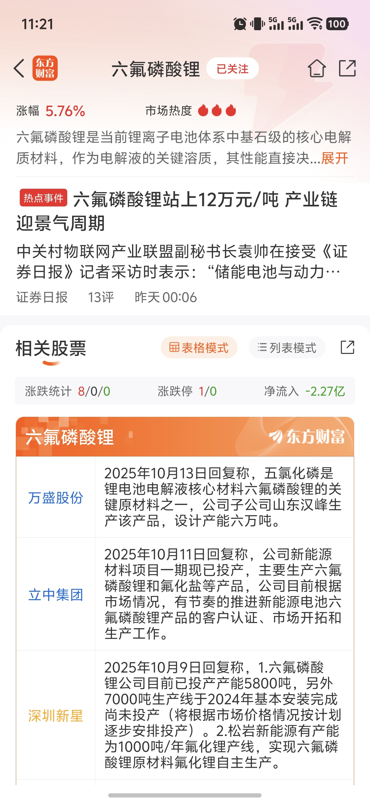 $兴发集团(SH600141)$ 深圳新星反包!!!!!六氟磷酸锂生产中使用最多的材料是五氯化磷,每生产1吨六氟磷酸锂需消耗约0.236吨黄磷(五氯化磷的关键原料)。其他主要原材料还包括氟化锂、氢氟酸等。磷矿、黄磷,有磷矿石的还没有真正的开始,明年磷矿石2800加!