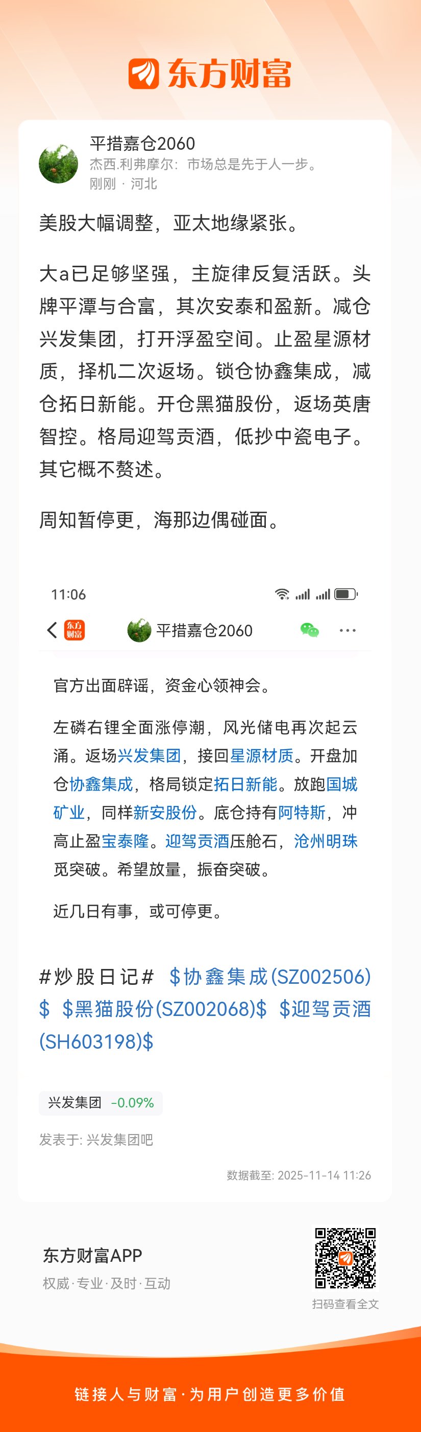 大a已足够坚强,主旋律反复活跃。头牌平潭与合富,其次安泰和盈新。减仓兴发集团,打开浮盈空间。止盈星源材质,择机二次返场。锁仓协鑫集成,减仓拓日新能。开仓黑猫股份,返场英唐智控。格局迎驾贡酒,低抄中瓷电子。其它概不赘述。