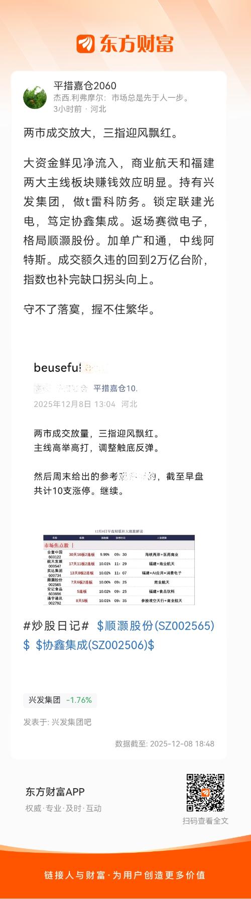 大资金鲜见净流入,商业航天和福建两大主线板块赚钱效应明显。持有兴发集团,做t雷科防务。锁定联建光电,笃定协鑫集成。返场赛微电子,格局顺灏股份。加单广和通,中线阿特斯。成交额久违的回到2万亿台阶,指数也补完缺口拐头向上。