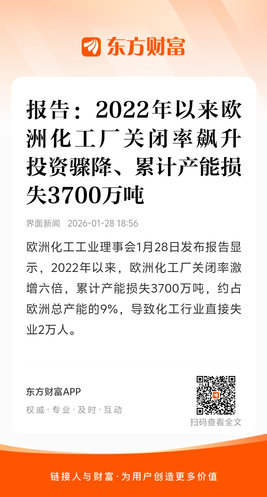 欧洲化工工业理事会(Cefic)1月28日发布报告显示,2022年以来,欧洲化工厂关闭率激增六倍,累计产能损失3700万吨,约占欧洲总产能的9%,导致化工行业直接失业2万人。