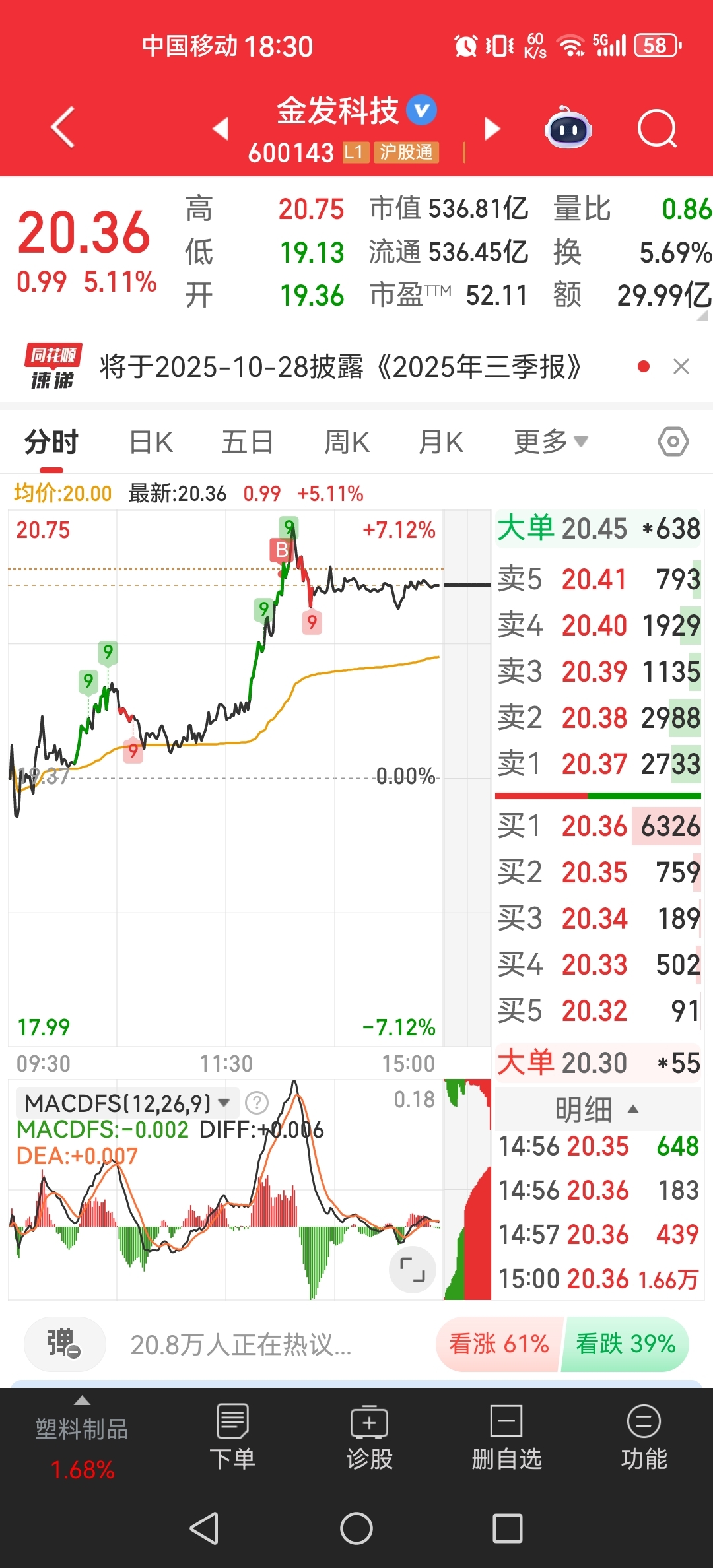 $金发科技(SH600143)$ 今天本可以涨停的,奈何最高点我一追就下来,再牛逼的股也逃不过我那点毛钱追跌的命运,眼看着三花四个点拉上去没追,后面追你把你买崩?