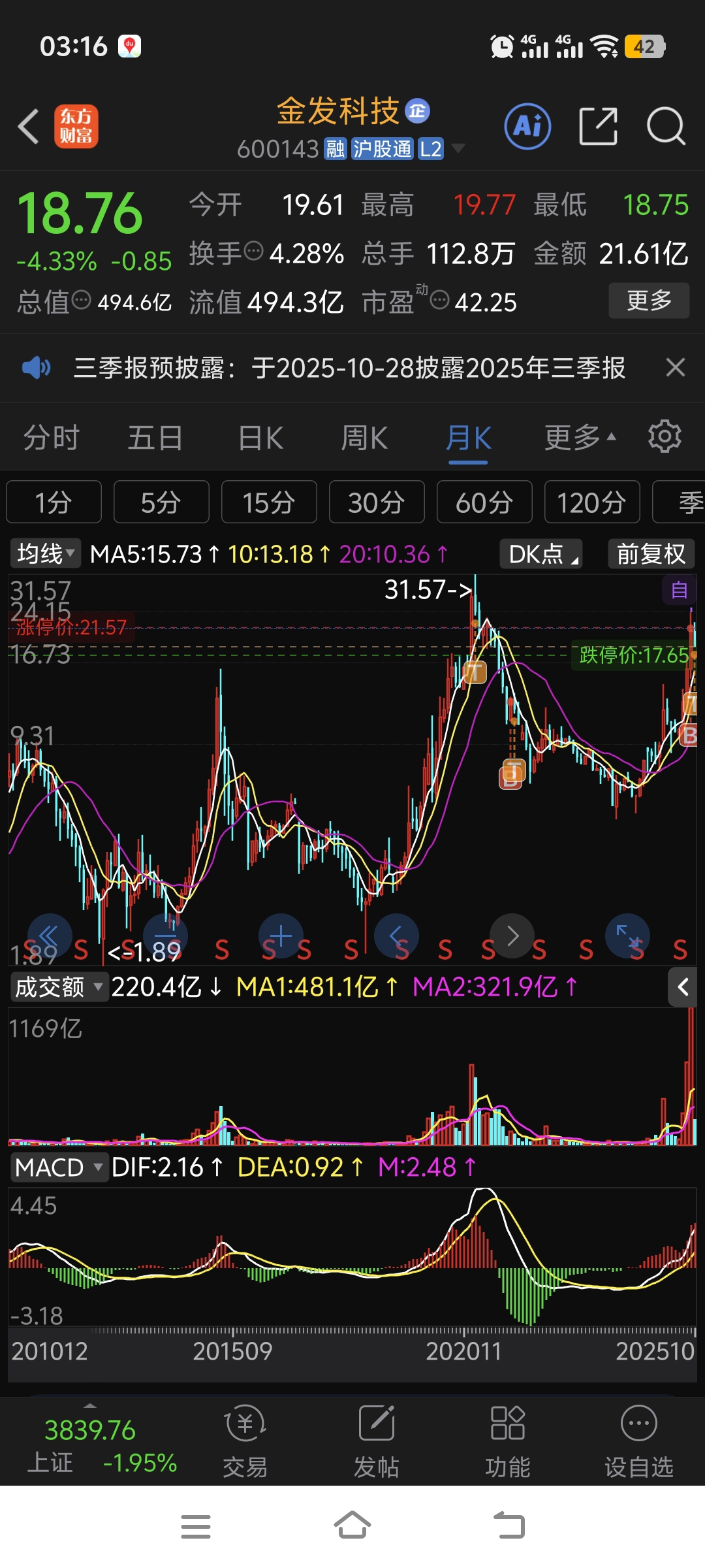 $金发科技(SH600143)$ 股友们这股你们怎么看?我看这波要退了,感觉我被挂山顶了呢!