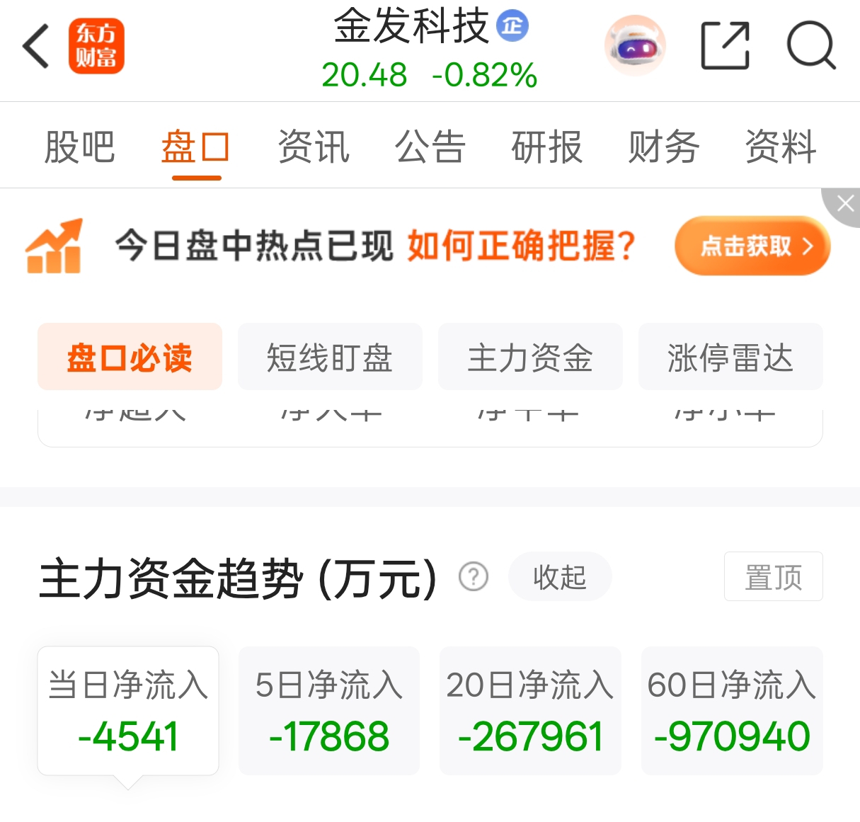 $金发科技(SH600143)$ 20天跑了快27个亿