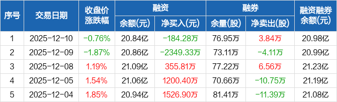 金发科技:融资净偿还184.28万元,融资余额20.84亿元(12-10)