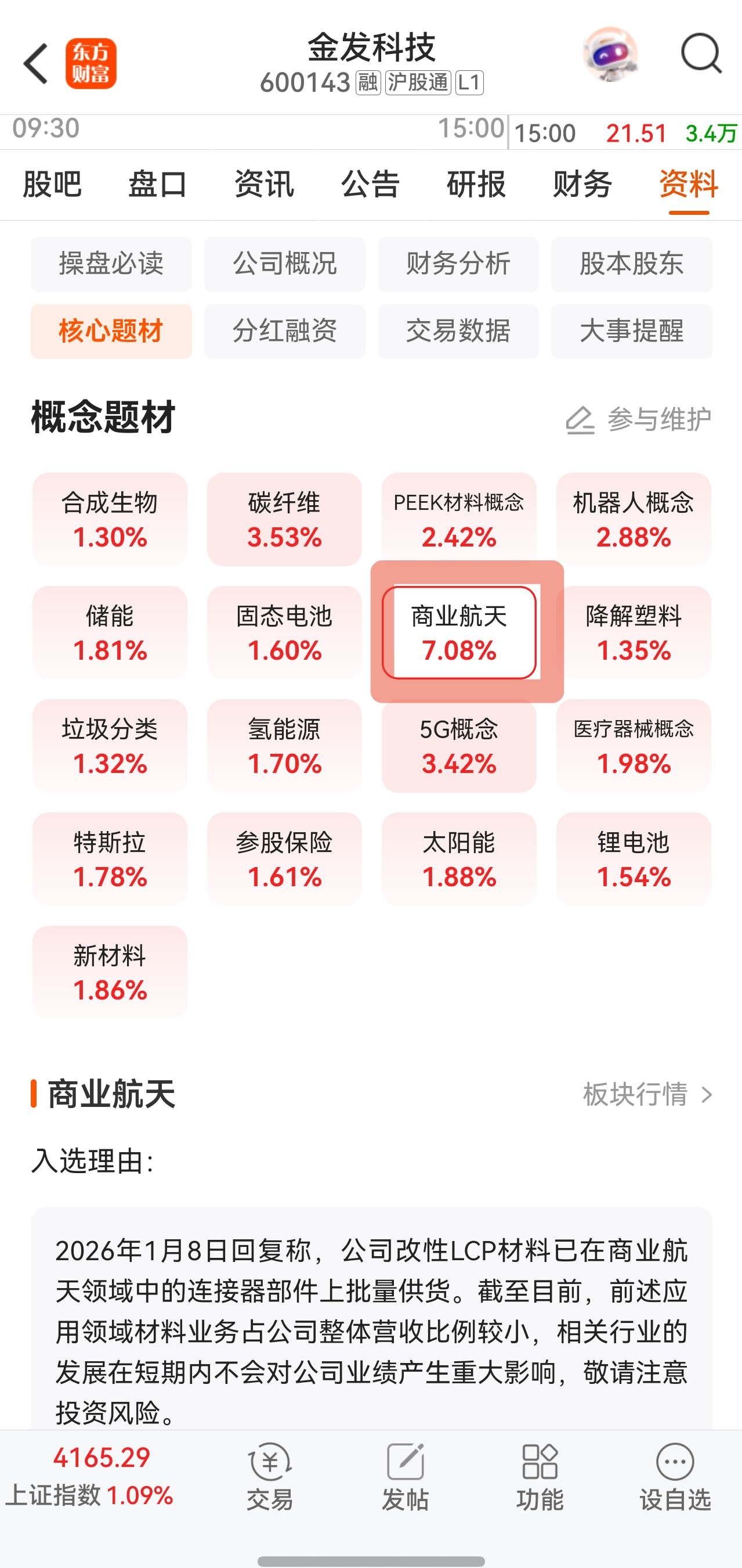$金发科技(SH600143)$ 今天新增商业航天概念,一个板就够嘛?!