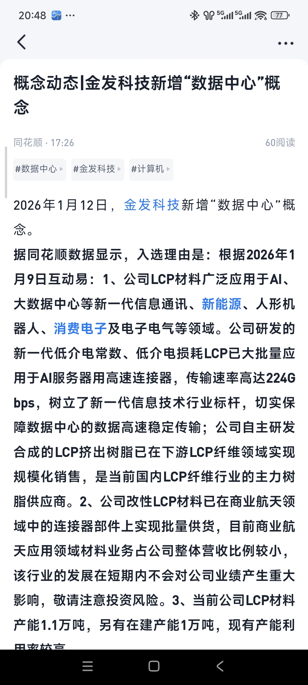 $金发科技(SH600143)$ 今天同花顺,金发科技新增AI数据概念