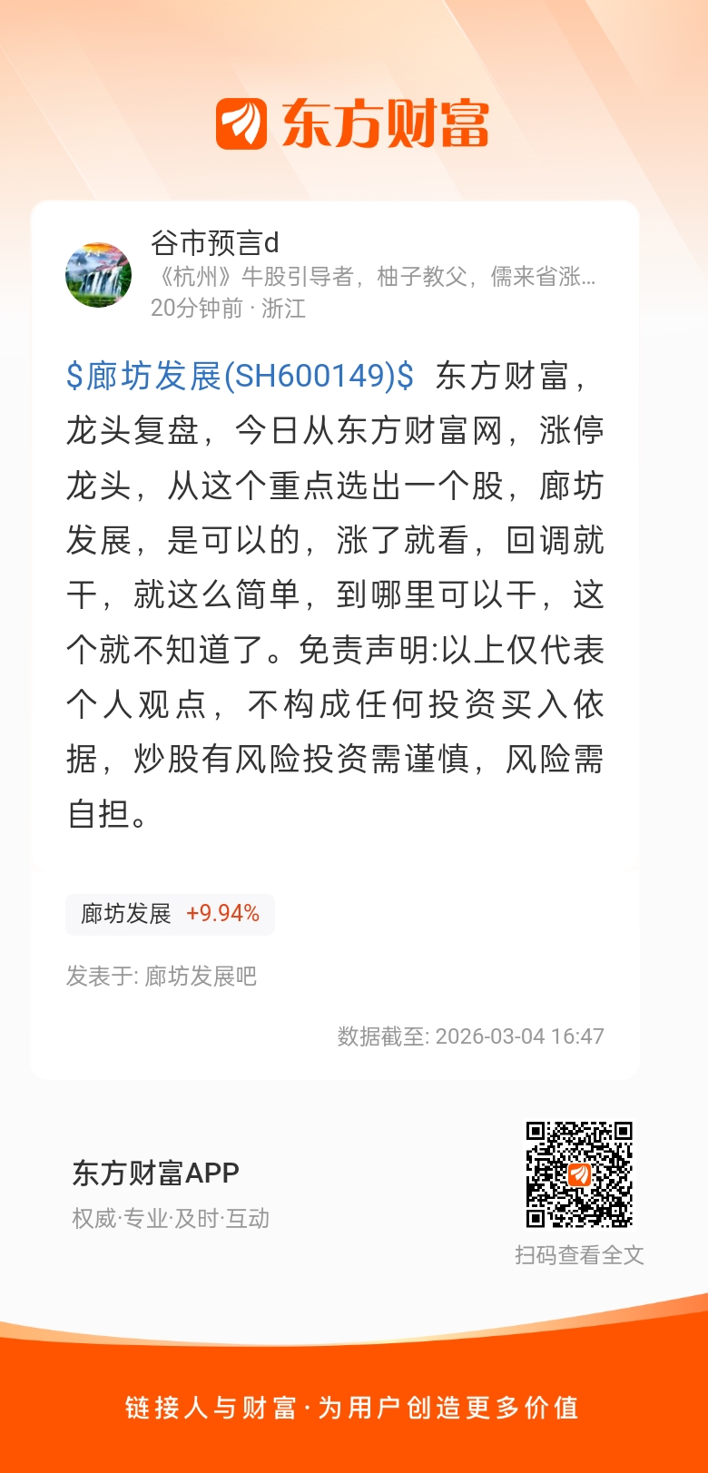 $廊坊发展(SH600149)$ 东方财富,龙头复盘,今日从东方财富网,涨停龙头,从这个重点选出一个股,廊坊发展,是可以的,涨了就看,回调就干,就这么简单,到哪里可以干,这个就不知道了。免责声明:以上仅代表个人观点,不构成任何投资买入依据,炒股有风险投资需谨慎,风险需自担。