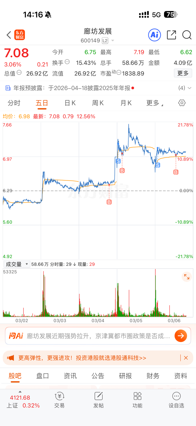 $廊坊发展(SH600149)$ 持股第三天,t了两天,成本已经6.16了,加油,给力点