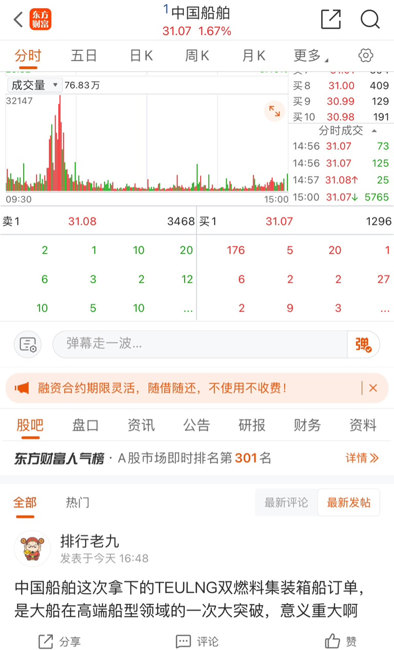 $中国船舶(SH600150)$ 真是无语,人气也是301...真滴搞事