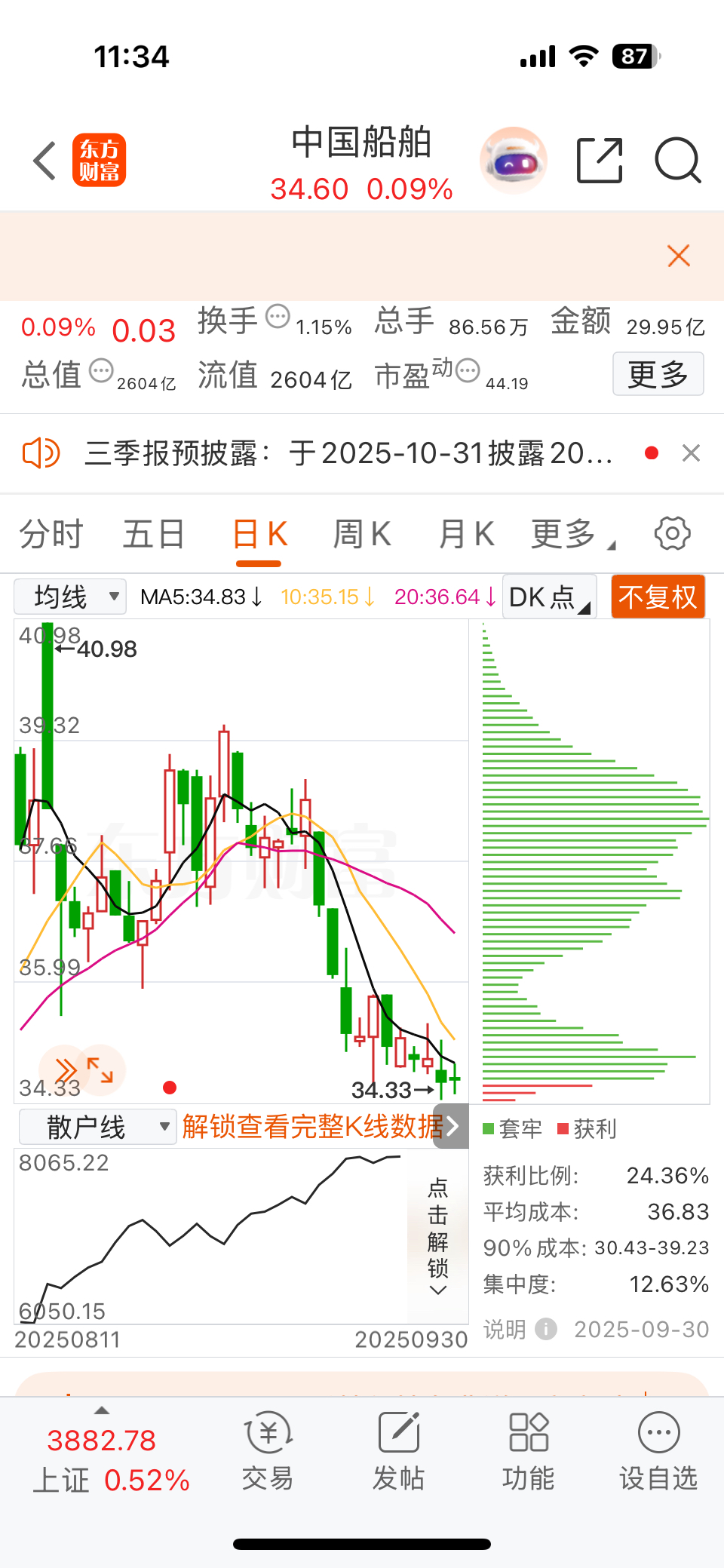 从筹码成本集中度看,12.63%左右的人掌控了90%成本在30.43 ~39.23元之间的筹码。