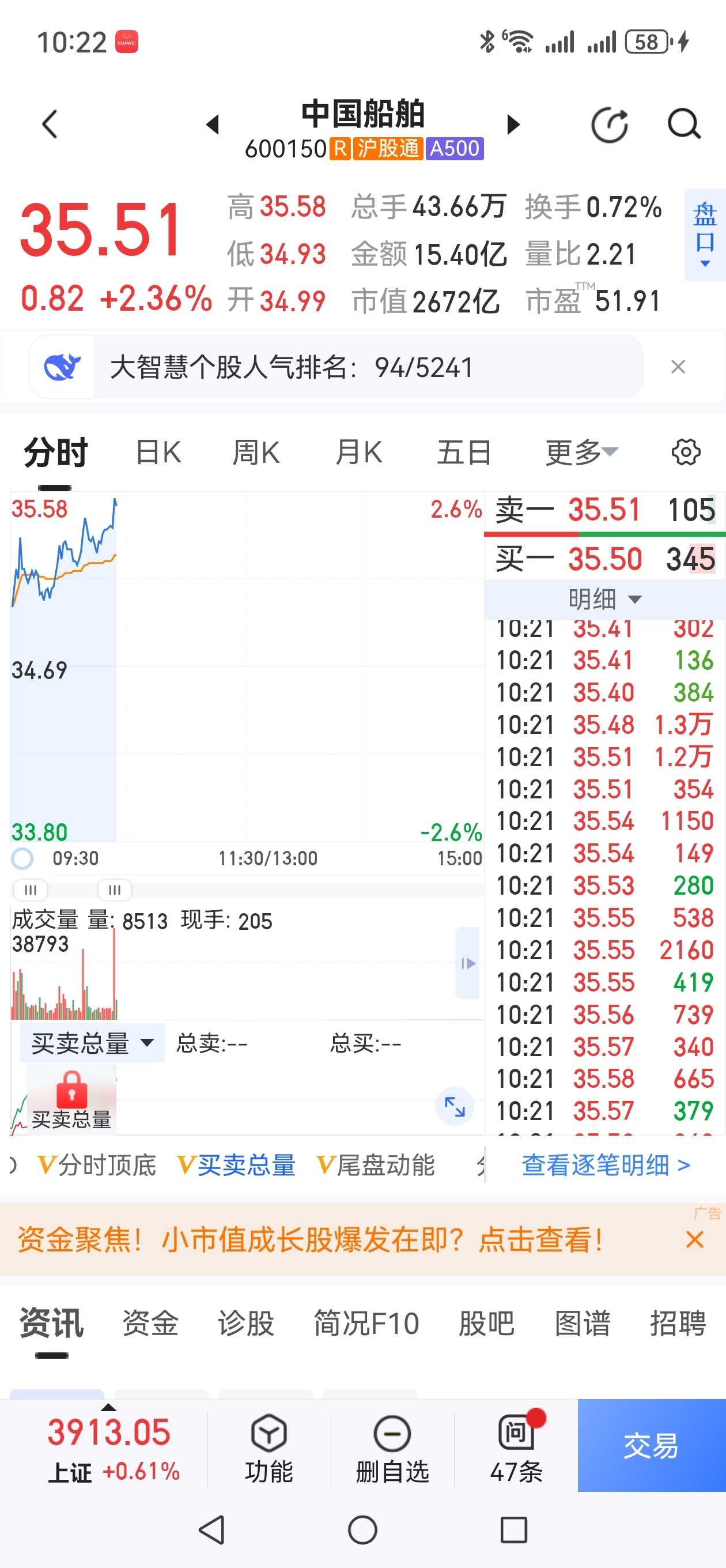 $中国船舶(SH600150)$ 这俩笔万手哥成交的时候有那么多卖盘吗?