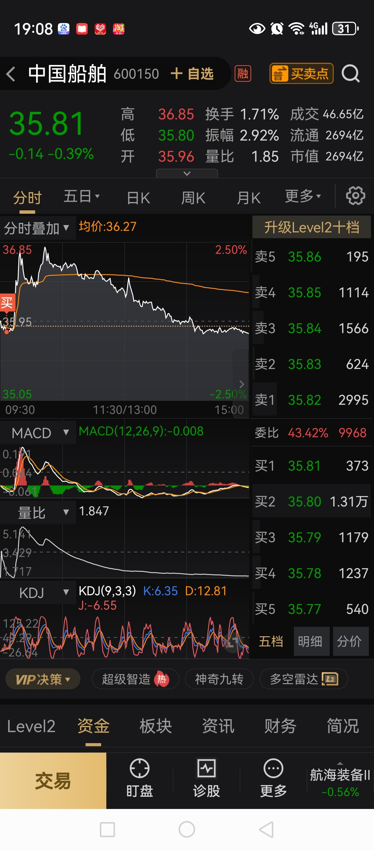 $中国船舶(SH600150)$ 今天够刺激,早上35.82买入,冲高36.85,收35.81,哈哈,你们还好吗