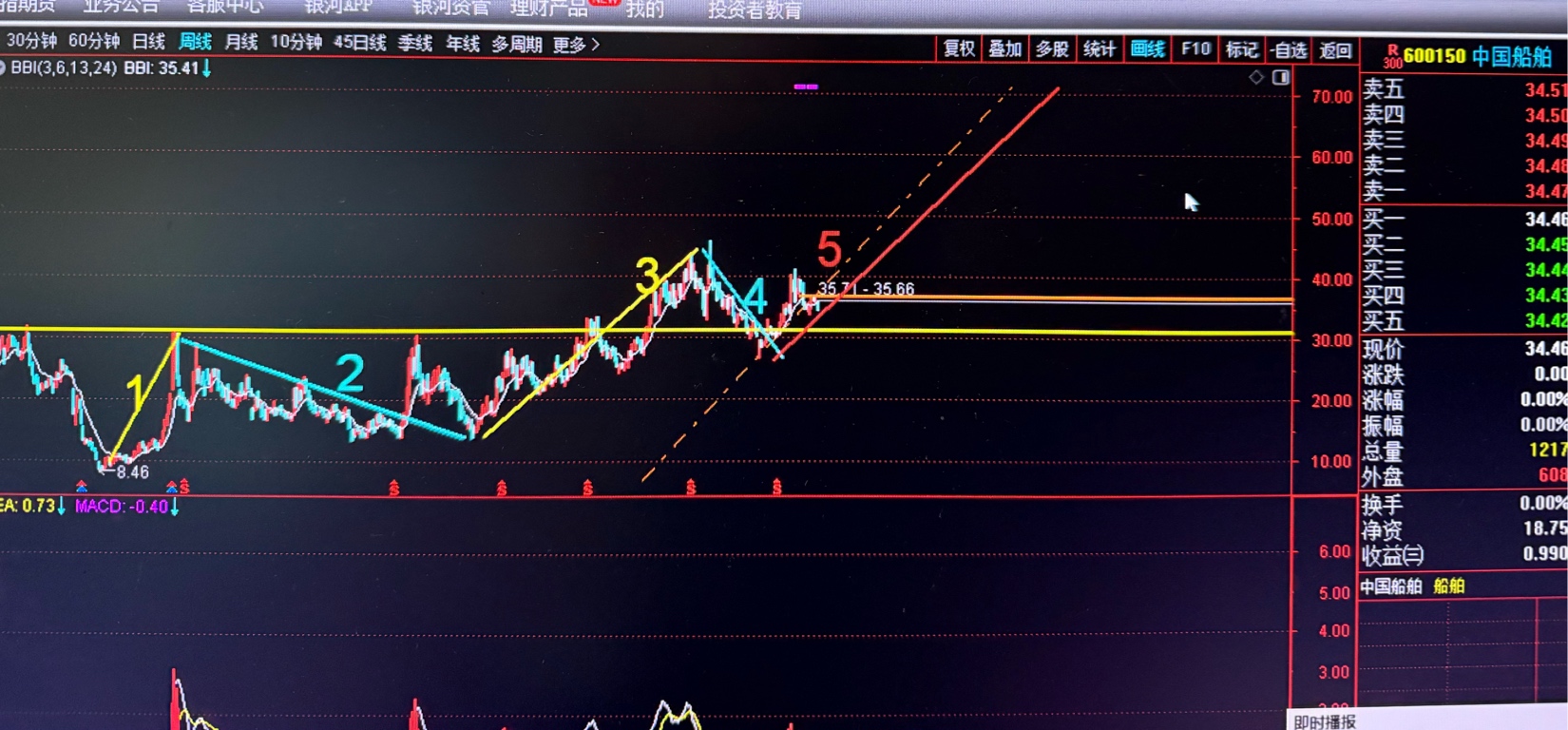 $中国船舶(SH600150)$ 用周K线数一下浪里格浪