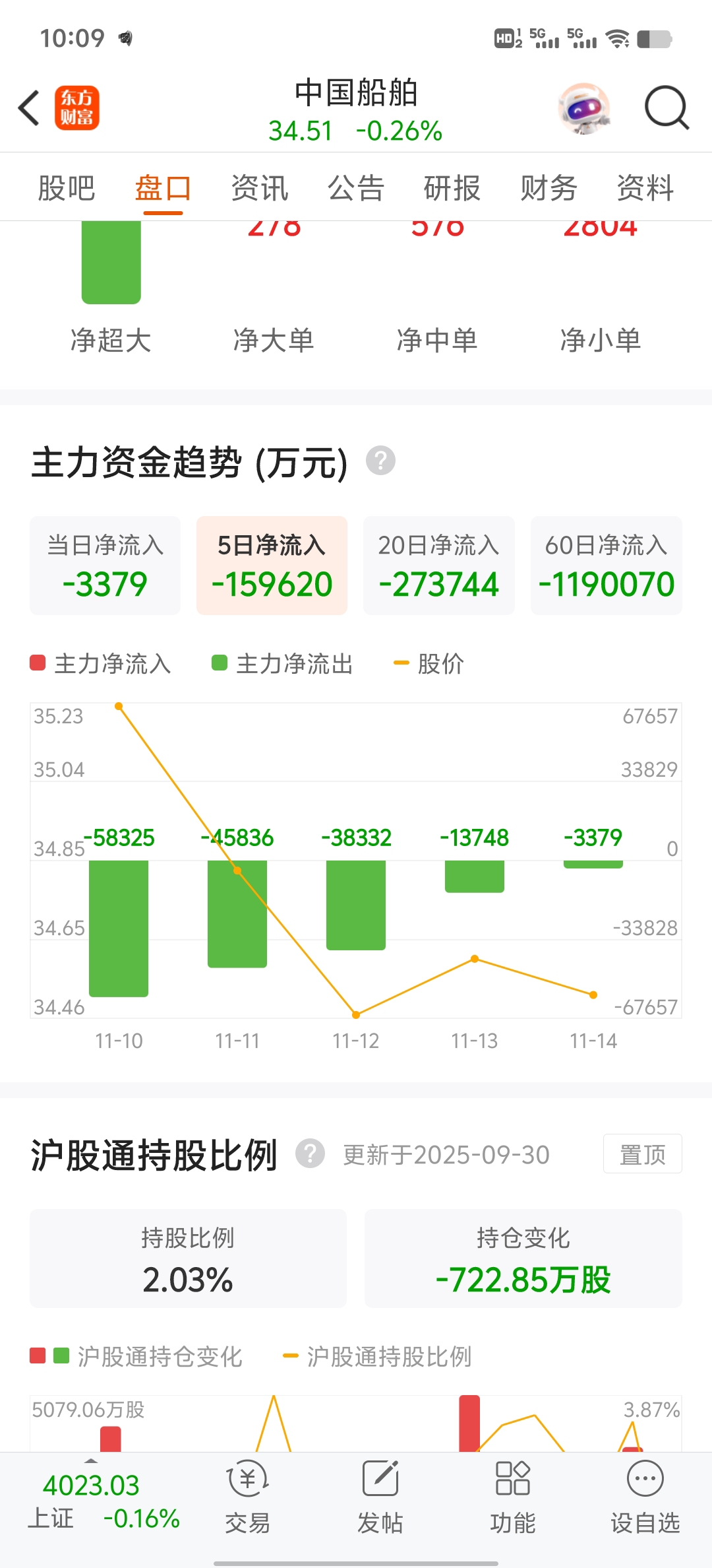 $中国船舶(SH600150)$ 60天跑了近120亿,每天2亿,怎么可能涨。那个傻帽会在流入一百多亿给他拉起来