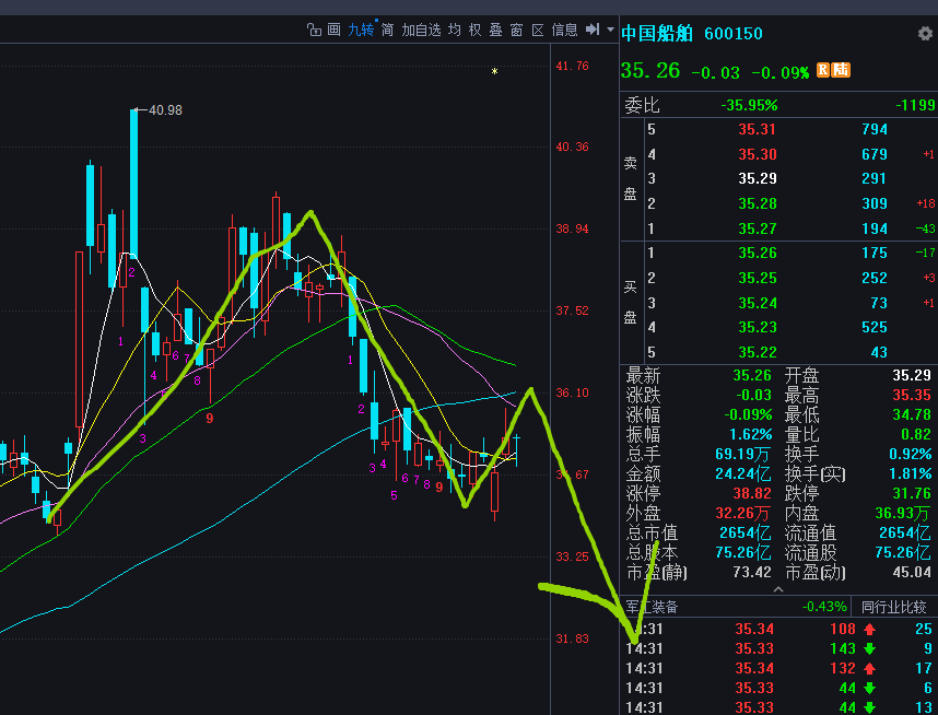 至于中船600150,38.5元以上我就唱空观点了,跌到33元+你们都不承认你们错了,我就不说啥了,画张图套加盐猴子和意银大师“银河花江”。
