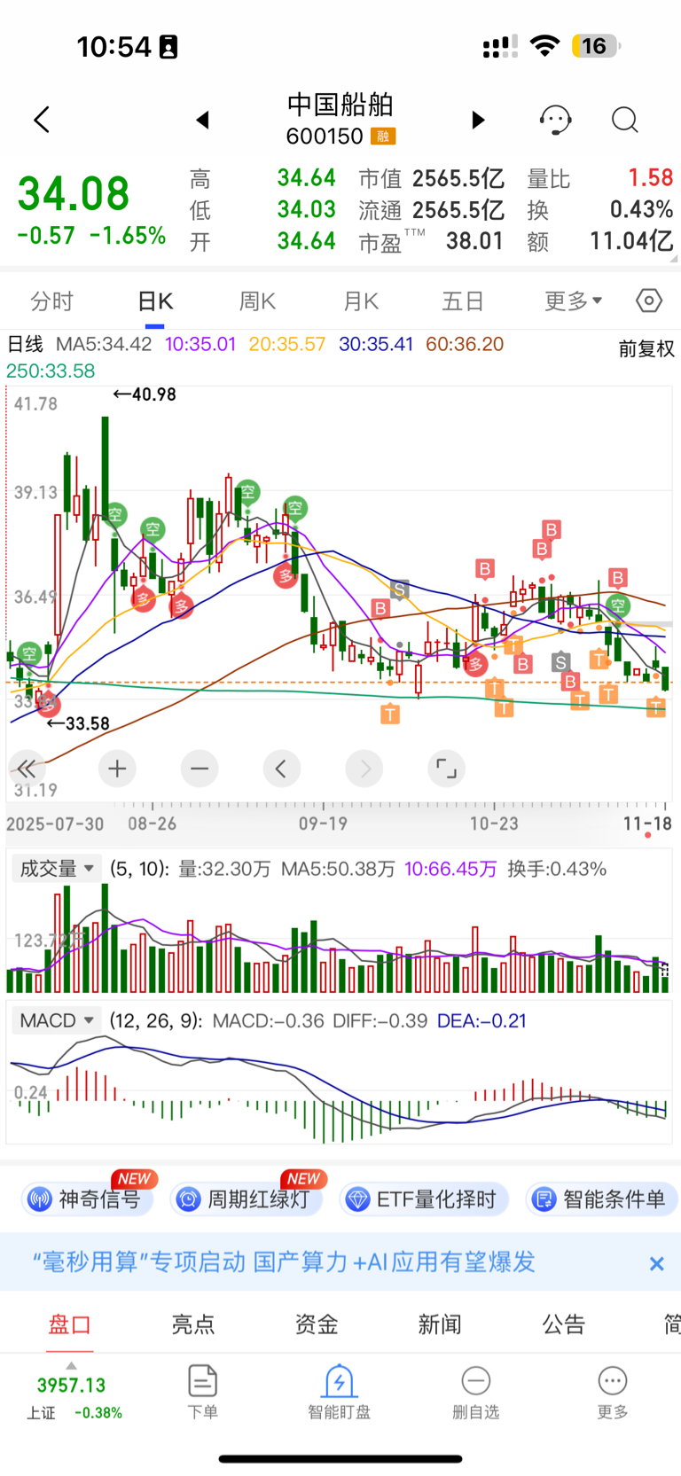 $中国船舶(SH600150)$ 把昨天35.08卖的买回来了,成本t到34.2了都还是亏