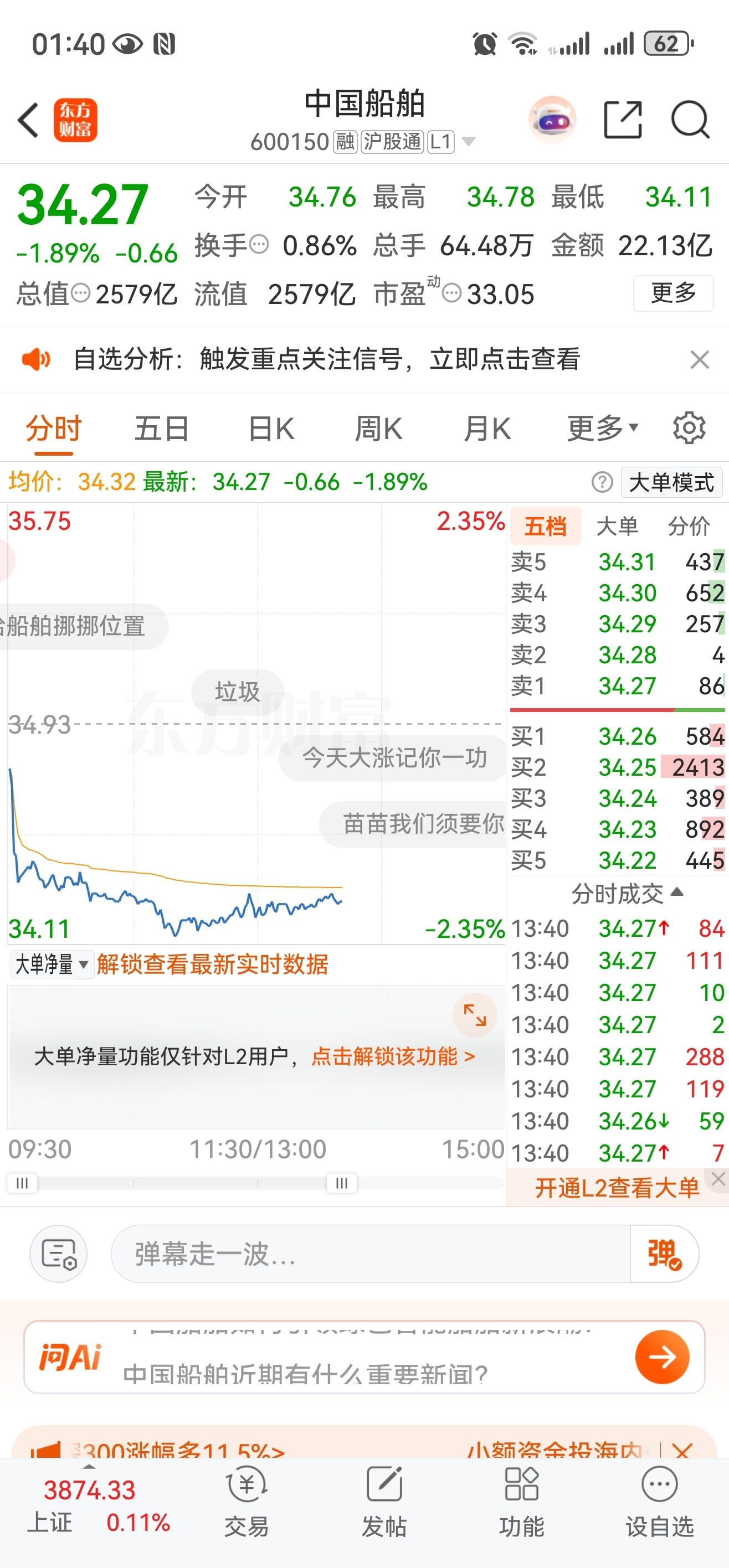 $中国船舶(SH600150)$ 这线条说明,早上主力一抛,整天散户挣扎!