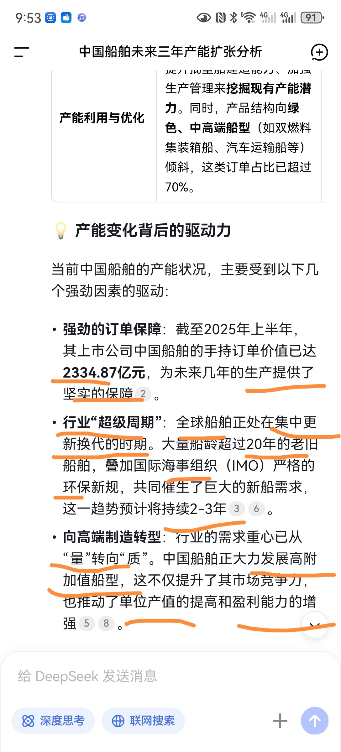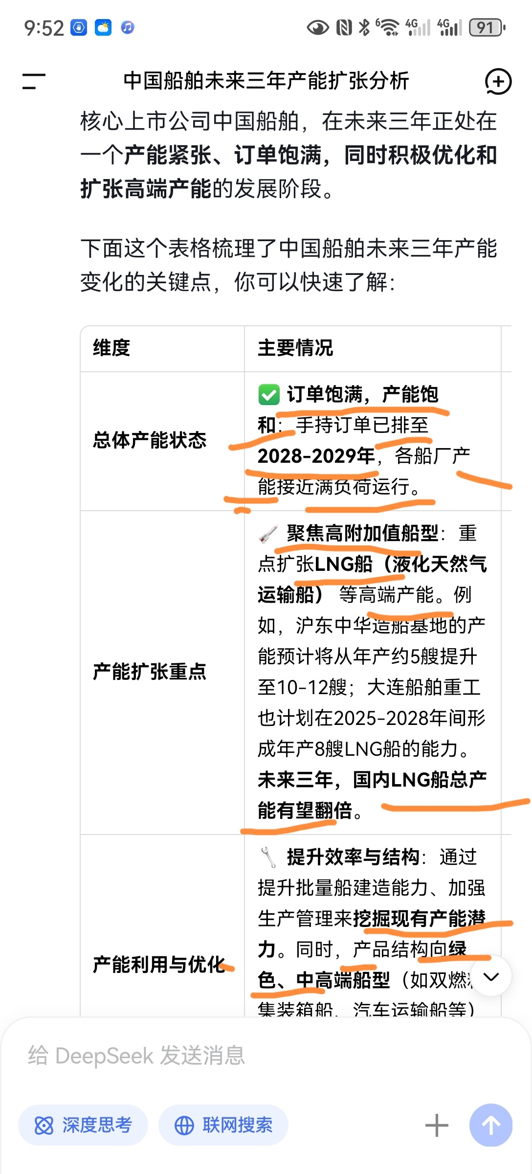 $中国船舶(SH600150)$ 中国船舶订单,已经排到2028~2029年了,各子船厂满负荷运营,产能扩张主要聚焦在高附加值船型(如LNG船),利用现有的产能,产品结构转向绿色、中高端船(双燃料集装箱、汽车运输船),从量向质转变。目前处于行业“超级周期”,20年老旧船只大量更换,叠加国际海事组织的环保要求。市盈率30多倍,处于平均线地位。