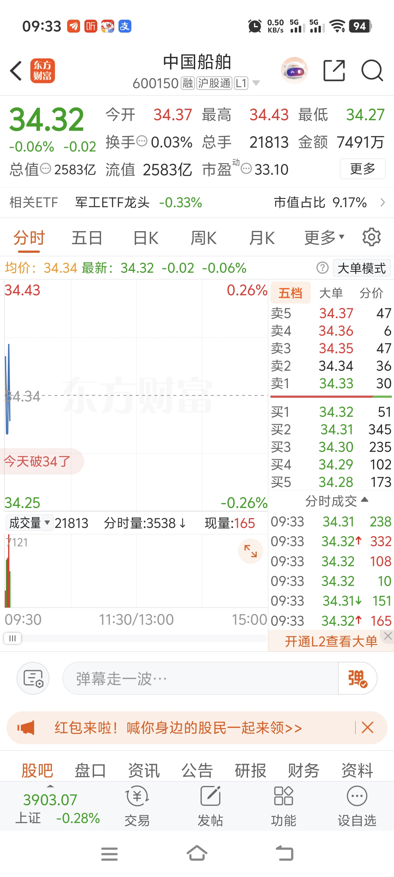 $中国船舶(SH600150)$ 这才是真实的交易样子,上方没抛单,全是主力压的!