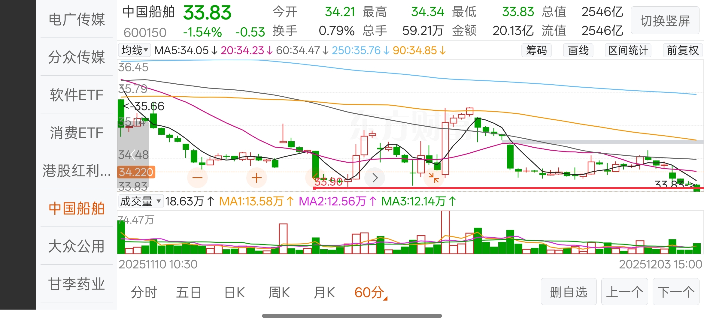 $中国船舶(SH600150)$ 跌破了,看三天。