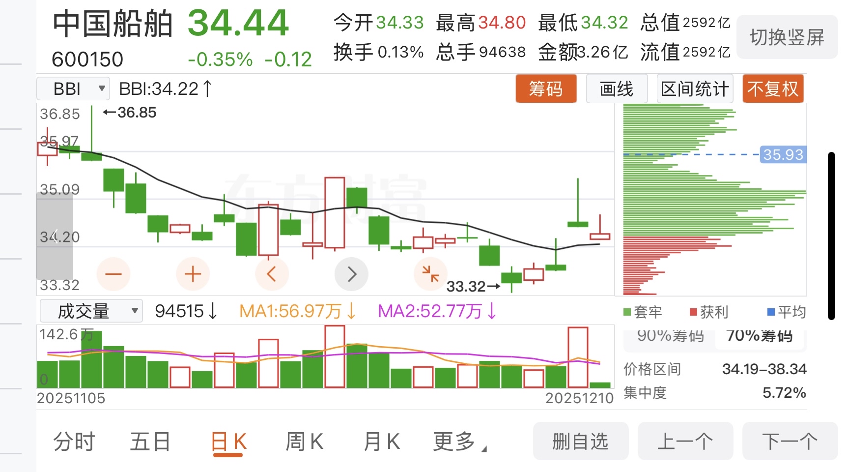 $中国船舶(SH600150)$ 从筹码集中度看,大部分筹码都被主力收了去了。