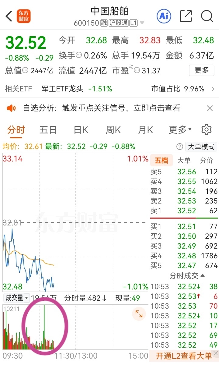 $中国船舶(SH600150)$ 这样的大绿棒棒都是主力对倒的痕迹