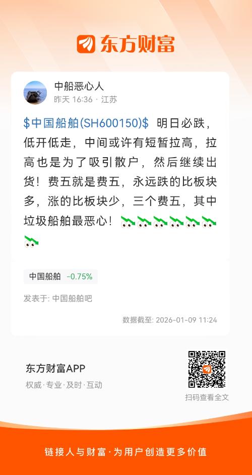 $中国船舶(SH600150)$ 明日必跌,低开低走,中间或许有短暂拉高,拉高也是为了吸引散户,然后继续出货!费五就是费五,永远跌的比板块多,涨的比板块少,三个费五,其中垃圾船舶最恶心!