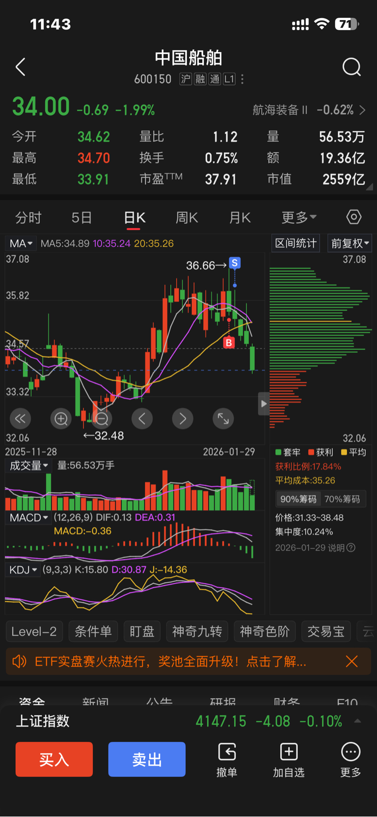 $中国船舶(SH600150)$ 不知道暂时离场对不对?