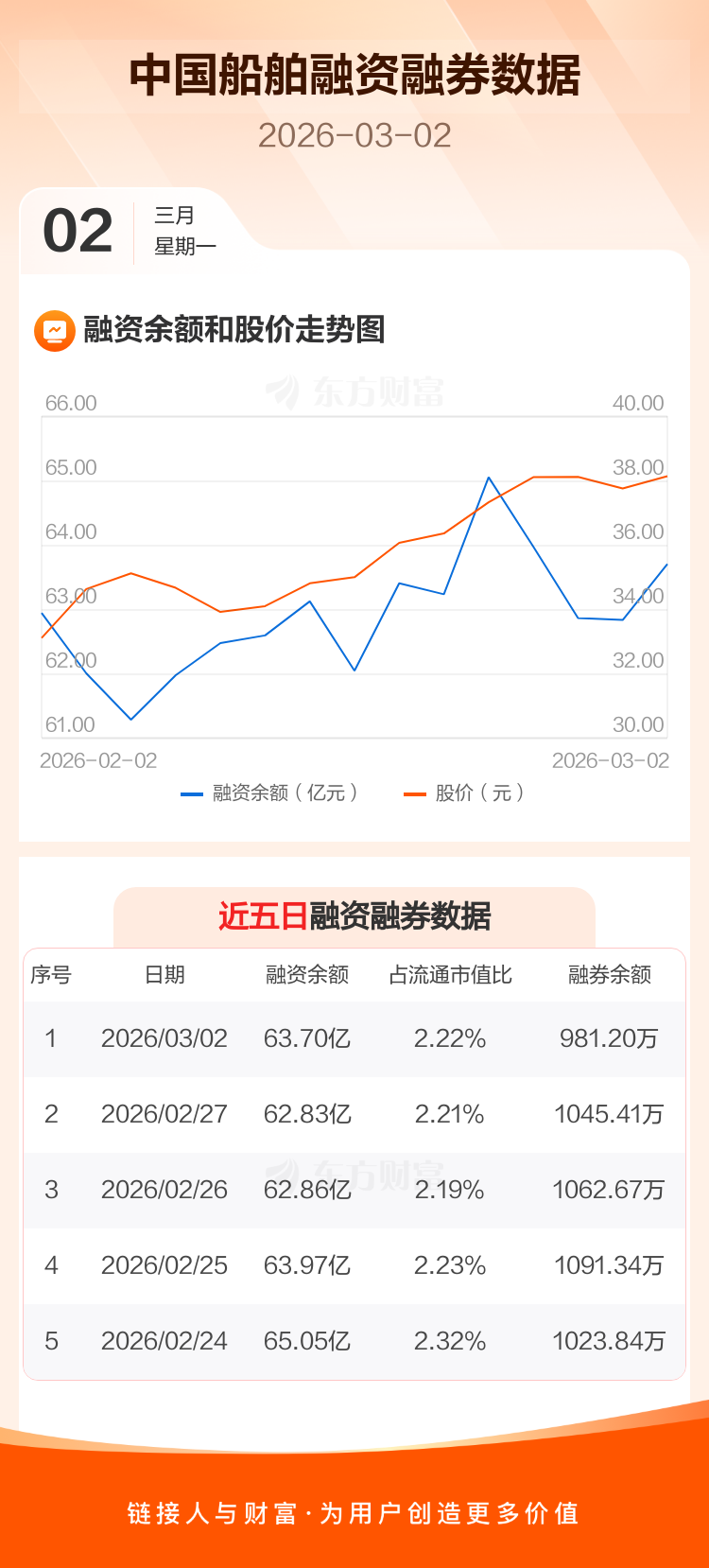 交易所最新数据显示,中国船舶于2026年3月2日获融资买入5.50亿元,融资偿还4.63亿元,当日融资净买入8692.77万元。目前,该股融资余额63.70亿,占流通市值比例为2.22%。
