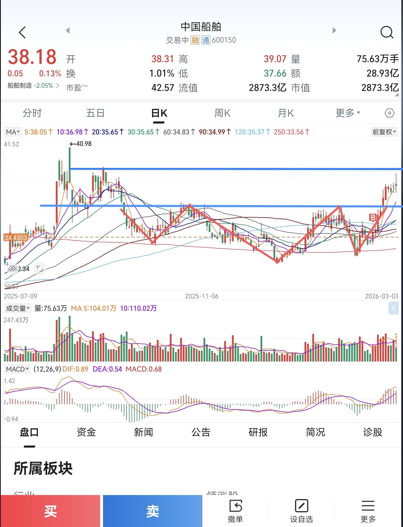 $中国船舶(SH600150)$ 中长线,离开亚星,来了中船,牛市跟着龙头跟着机构,近期堆量突破头肩底颈线,来到了压力区,最好能回踩颈线位附近确认,届时区间补仓,机构票一旦趋势形成,不容易转势,这支票逻辑就不多说了。