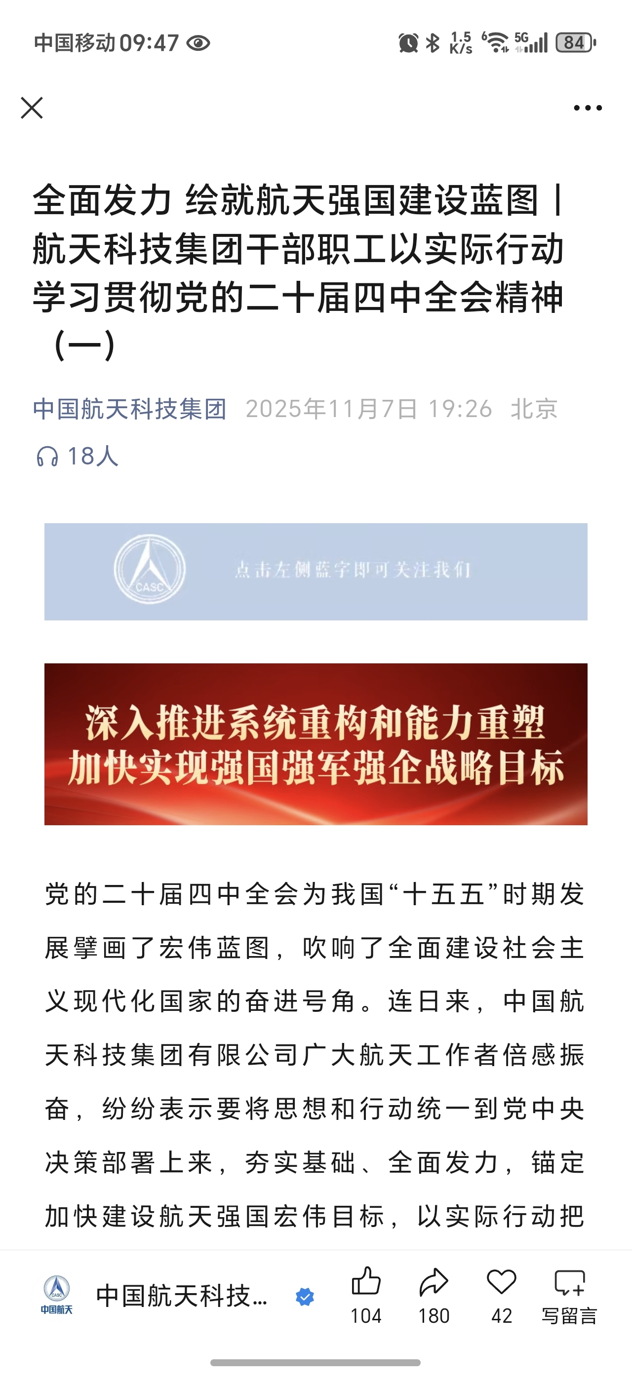 航天科技集团微信公众号最新发布的内容提到火箭和卫星在内的重大改革重组,而且官文在