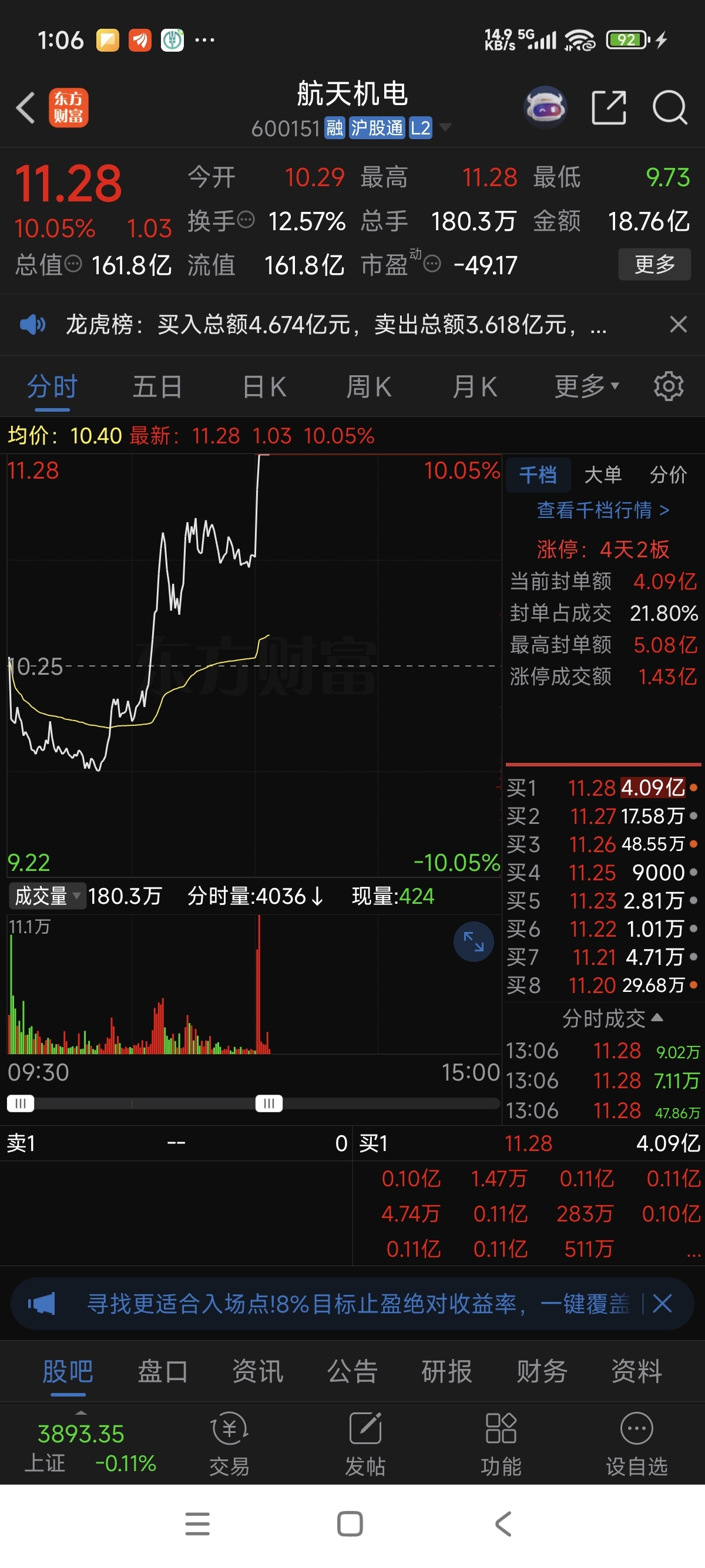 $航天机电(SH600151)$ 今天的遗憾!昨晚选好的亚光和航电,结果过8.12元先买了亚光,不及预期马上拉起来不说还往下坠!就没敢买航电了,看见航电起来了也没敢去追买!这不,涨停了……