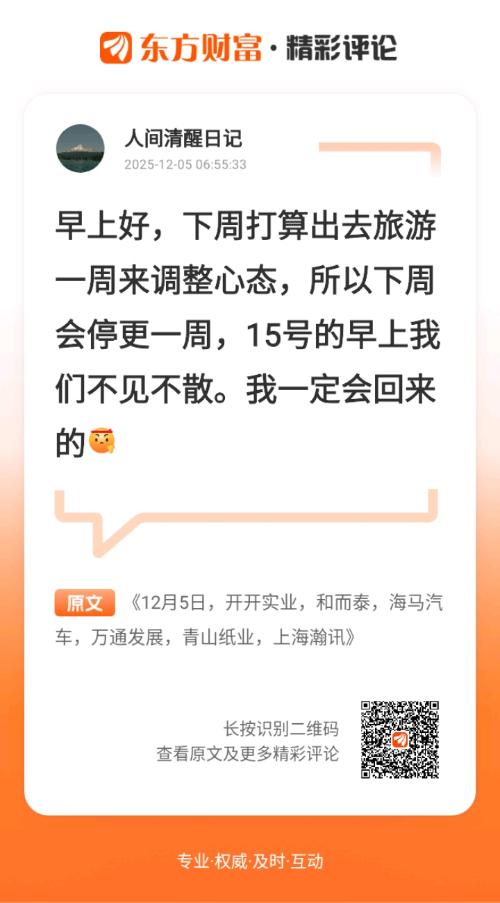 $航天机电(SH600151)$//@人间清醒日记 :早上好,下周打算出去旅游一周来调整心态,所以下周会停更一周,15号的早上我们不见不散。我一定会回来的