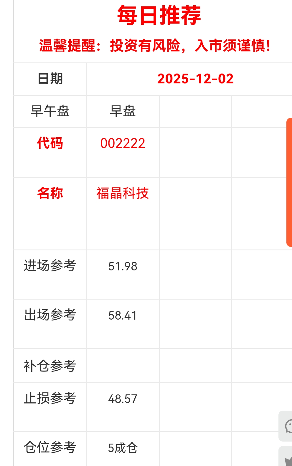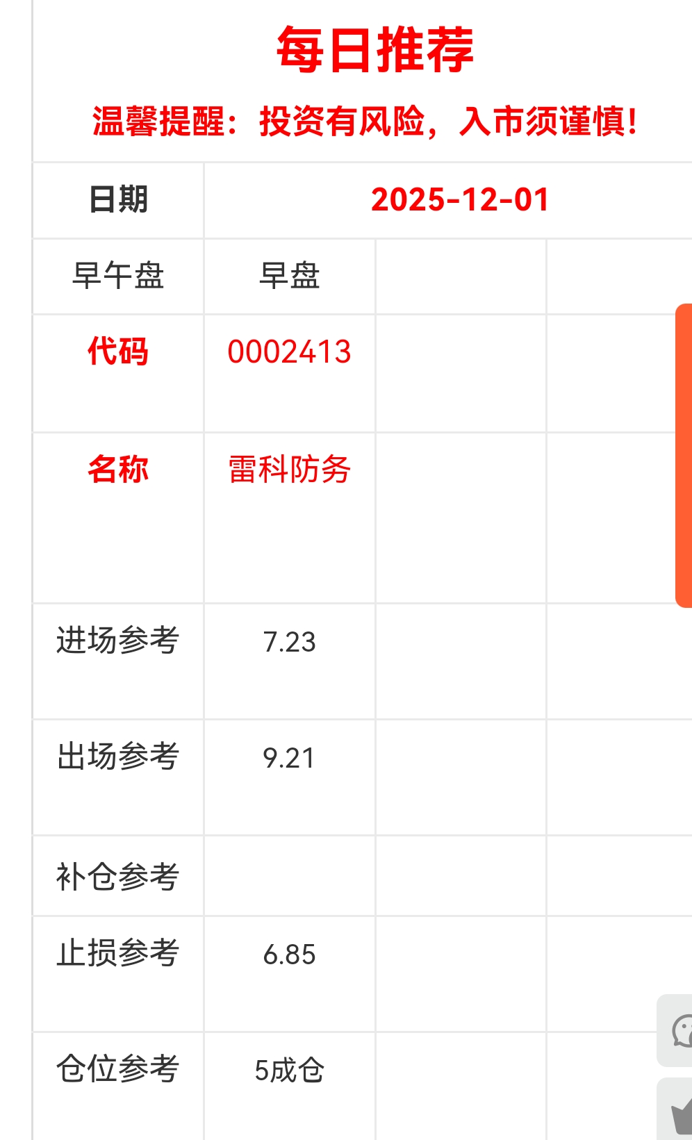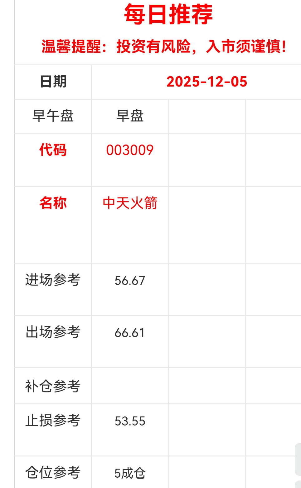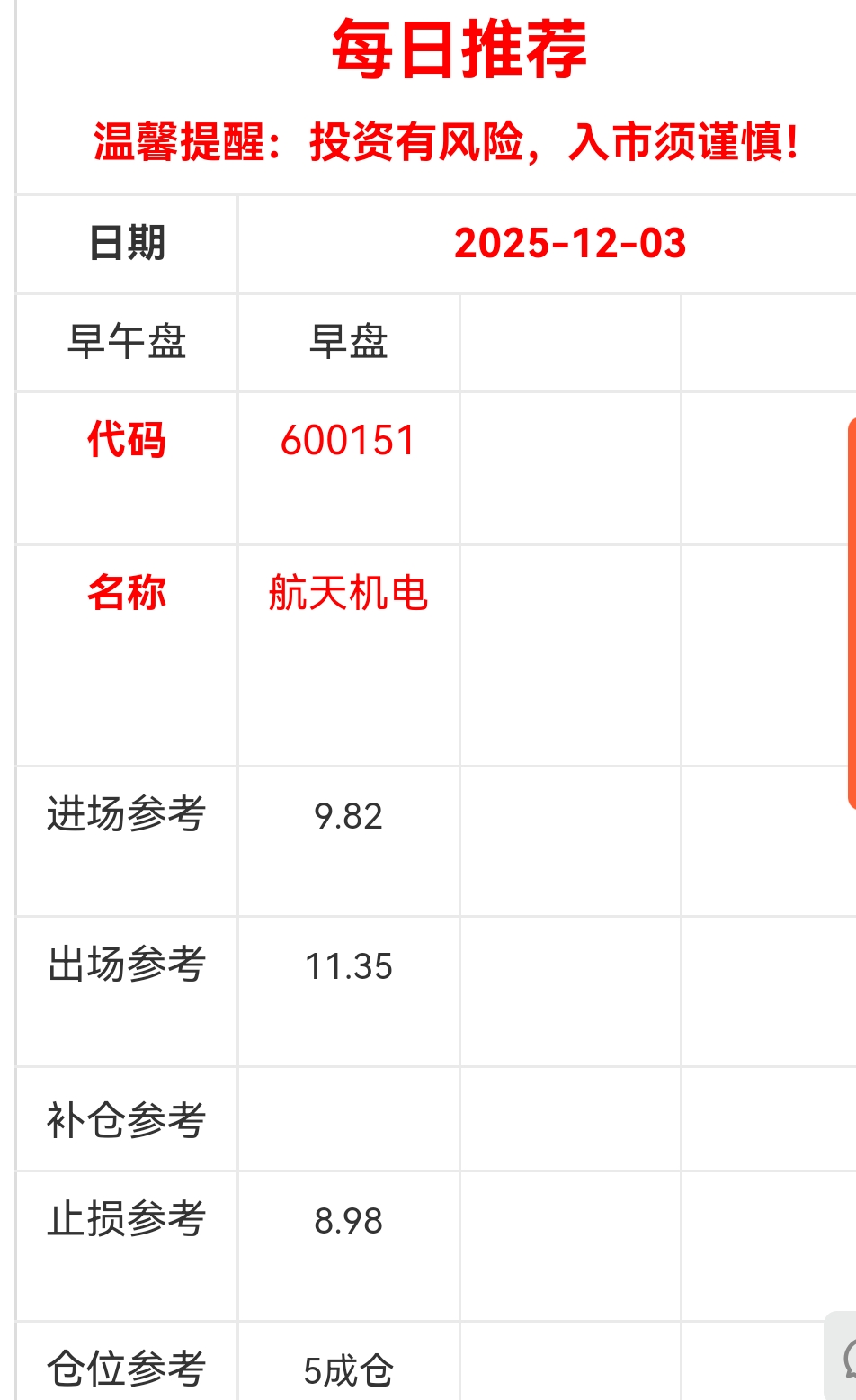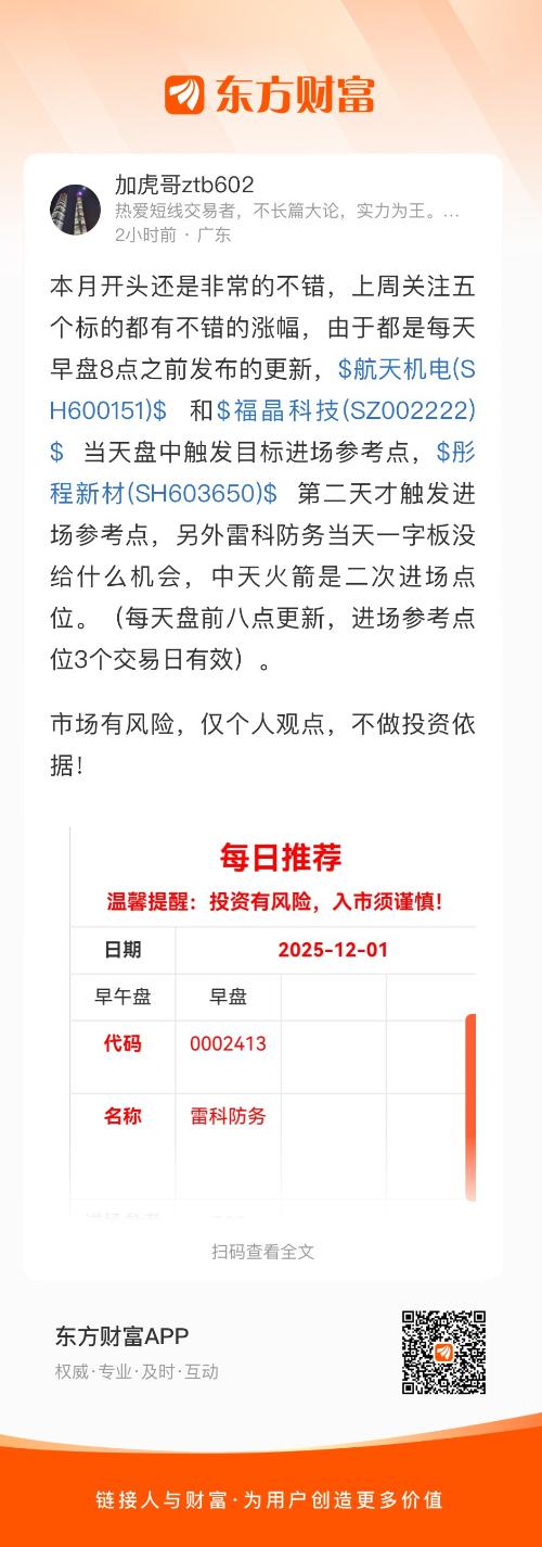本月开头还是非常的不错,上周关注五个标的都有不错的涨幅,由于都是每天早盘8点之前发布的更新,$航天机电(SH600151)$ 和$福晶科技(SZ002222)$ 当天盘中触发目标进场参考点,$彤程新材(SH603650)$ 第二天才触发进场参考点,另外雷科防务当天一字板没给什么机会,中天火箭是二次进场点位。(每天盘前八点更新,进场参考点位3个交易日有效)。