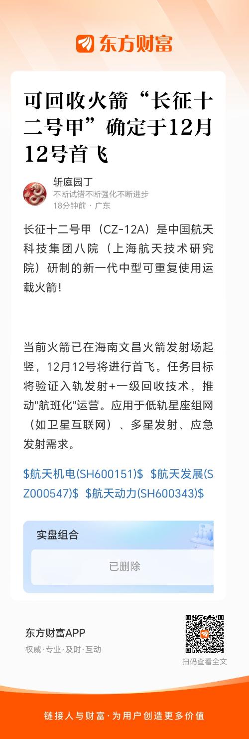 当前火箭已在海南文昌火箭发射场起竖,12月12号将进行首飞。任务目标将验证入轨发射+一级回收技术,推动"航班化"运营。应用于低轨星座组网(如卫星互联网)、多星发射、应急发射需求。