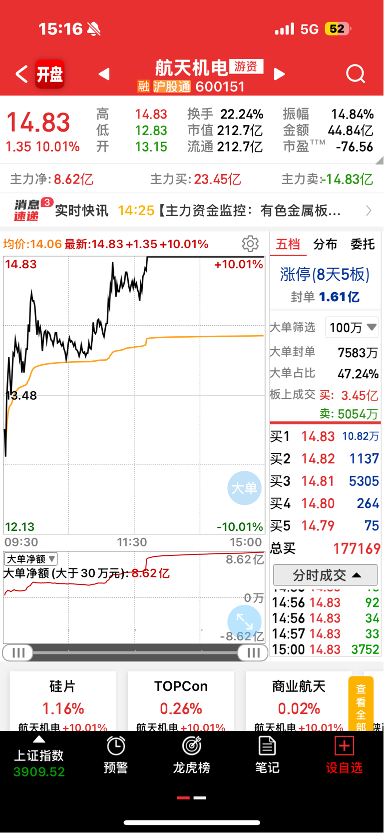 $航天机电(SH600151)$ 继续持有,昨天净流入8.62亿不可能为了进来砸盘,只有一个问题,那就是吸筹,如果砸盘早就跌停了