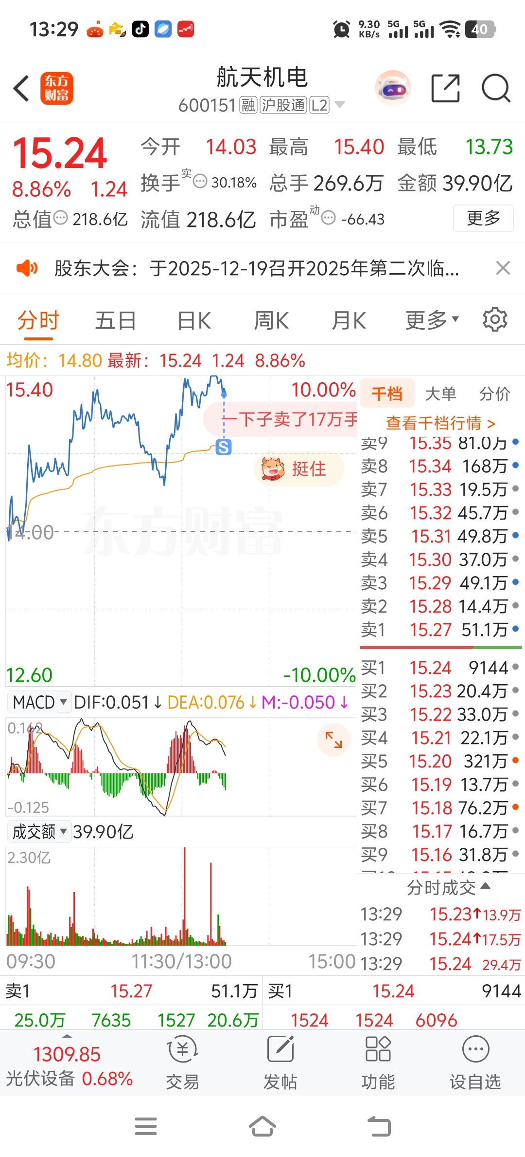 $航天机电(SH600151)$ 封不住,设置的条件单系统卖了,我是多头板上没砸