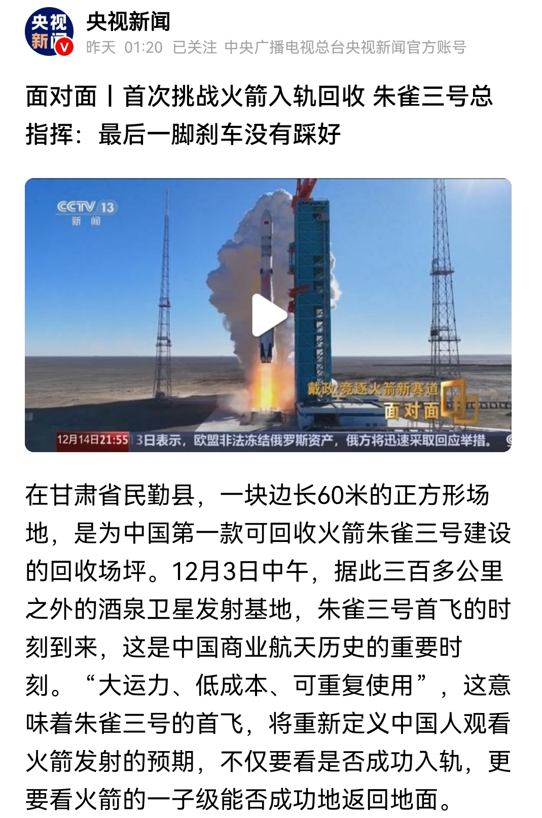 $航天机电(SH600151)$ 朱雀三号没有实现的,长征十二号甲来实现