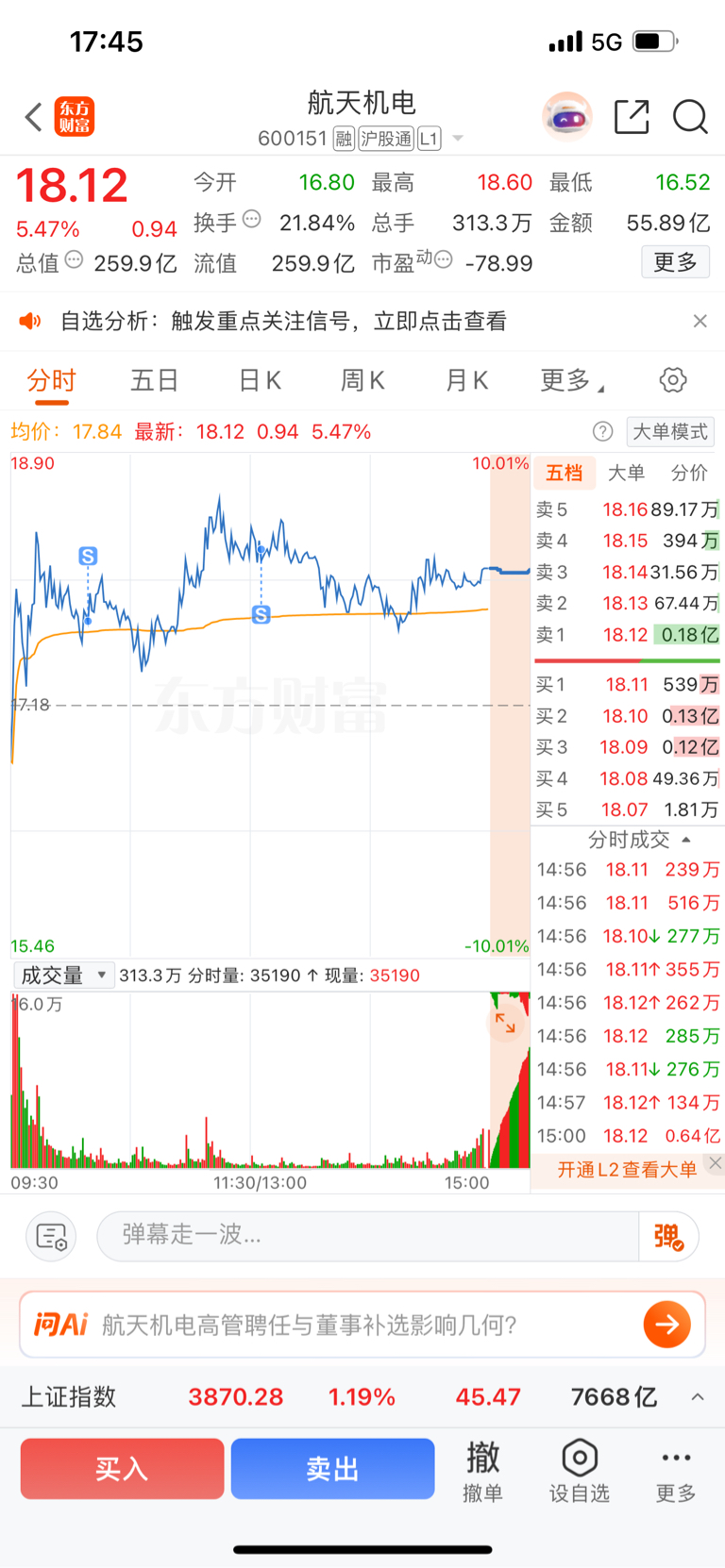 $航天机电(SH600151)$ 拿了一个多星期,从14块到18 ,已经达到我的预期了 ,先跑为敬