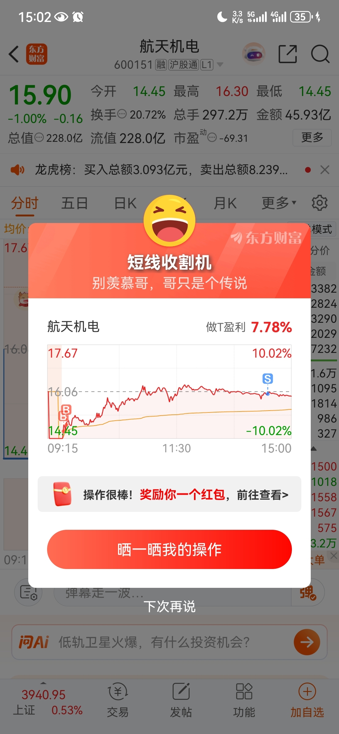$航天机电(SH600151)$ 昨天跌停,今天回本